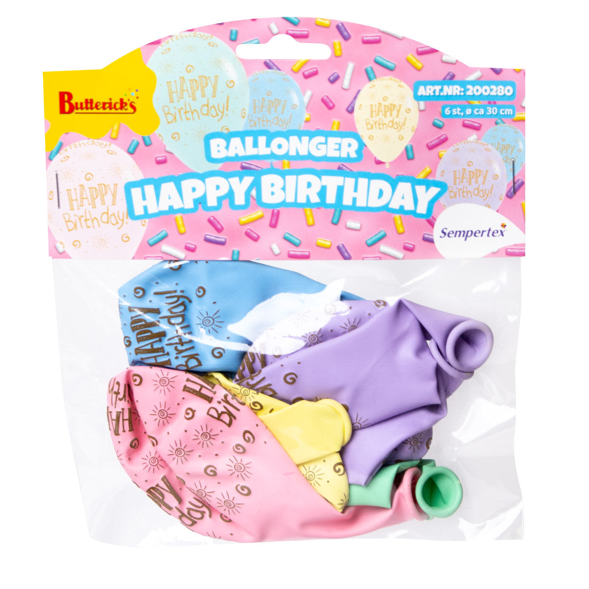 Pastelliga latexballonger med texten "Happy birthday" på, passar fint om det vankas födelsedagskalas eller till självaste dagen. Överraska kollegan med dessa grattis-ballonger, och vi kan lova att det blir uppskattat, för vem älskar inte fina ballonger. Fyll med heliumgas för en svävande effekt eller fäst i en ballongpinne.