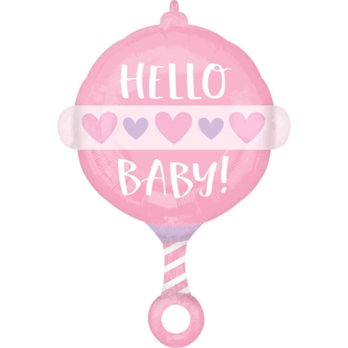 Den fina rosa färgen är perfekt att dekorera in i en ballongbukett och hello baby uttrycket och formen av en skallra är ett fint sätt att välkomma barnet hem första gången.