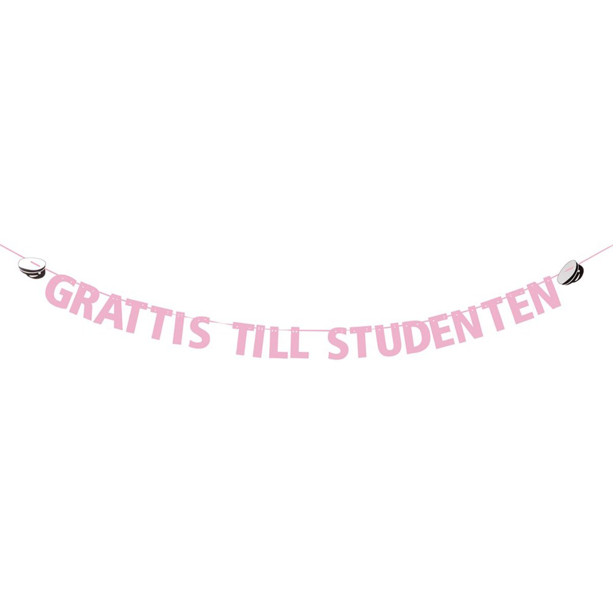 Grattis till studenten står det med rosa fina bokstäver på denna härliga girlang av utskurna pappbokstäver som hänger längs med snöret. Med denna rosa härgliga färgsplash kan du fira din student där hemma lätt genom att hänga girlangen mellan väggarna eller i dörröppningar.