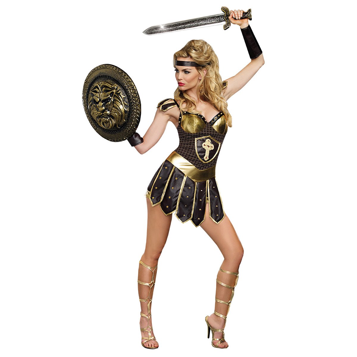 Känn dig som en kraftfull gladiator redo för strid med denna imponerande gladiatordräkt för kvinnor! Denna outfit kombinerar det klassiska med det eleganta genom sin svarta och gyllene design, och får dig att sticka ut på festen. Klänningen har detaljer i guld, en stilren korsdekoration på bröstet, och en avslutning med krigarinspirerade skärningar, vilket ger den en autentisk, romersk look. Perfekt för maskerader, halloween och temafester med antikt tema!