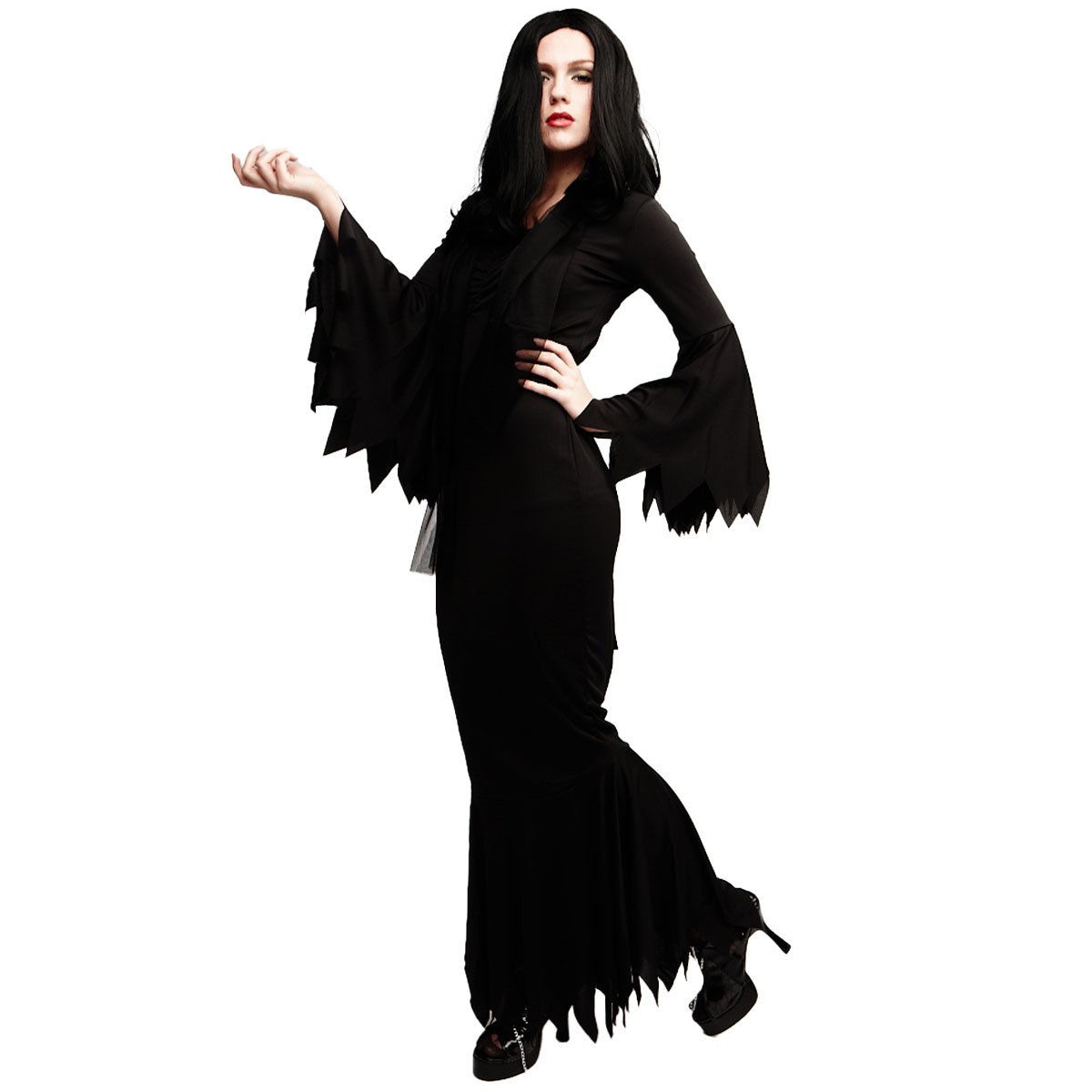 Vill du se ut som den ikoniska Mortica rekommenderar vi ett vitt puder i ansiktet och att sen komplettera dräkten med en svart häxklänning.