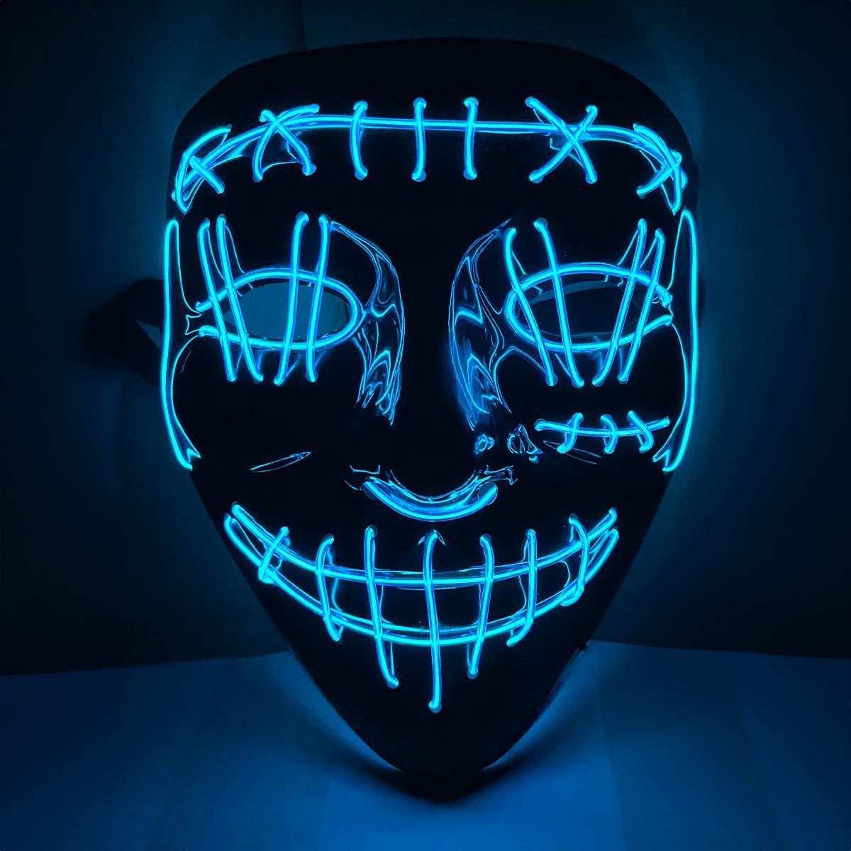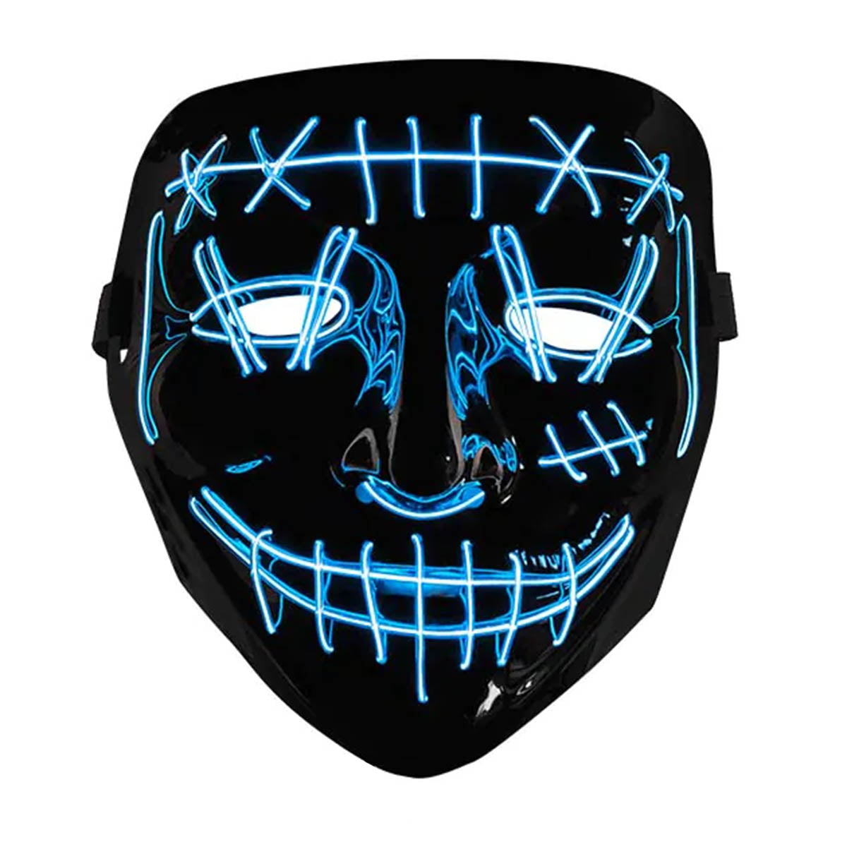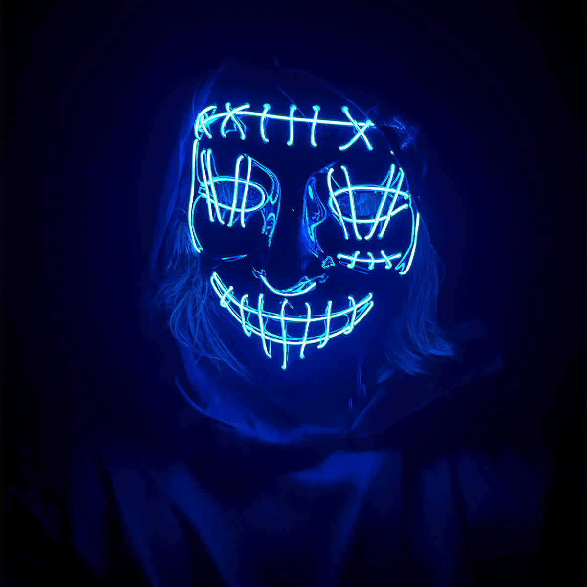 ED-masken "Killer Smile Blue" är den perfekta masken för dig som vill ta din halloweenutklädnad till nästa nivå. Med sina starkt lysande blå LED-linjer som formar ett ondskefullt leende och korsade ögon, kommer du garanterat att få uppmärksamhet. Den futuristiska och skrämmande designen är som gjord för att skapa en obehaglig stämning och en minnesvärd look som ingen kommer att glömma.