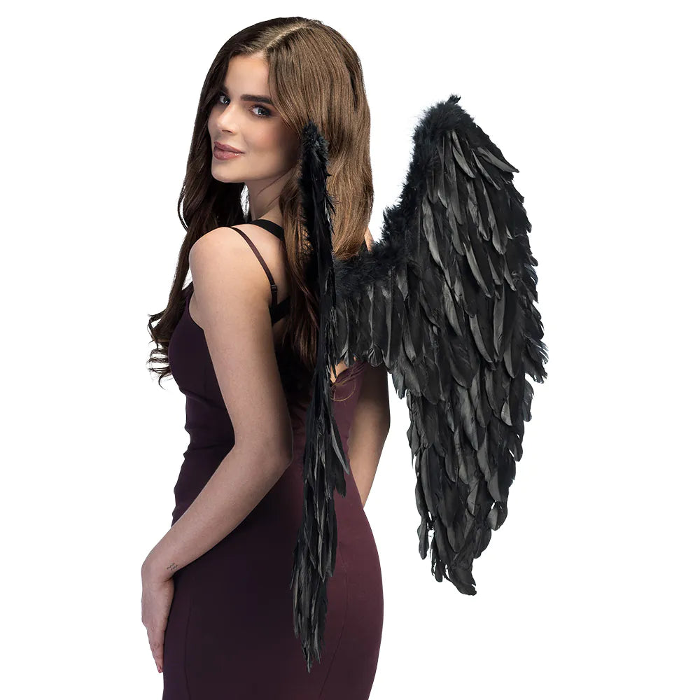 Dessa vackra svarta änglavingar ger din look en dramatisk och mystisk känsla. Med sina detaljerade fjädrar och imponerande storlek, passar de perfekt för en gotisk eller mörk ängeloutfit på halloween eller en temafest. Vingarna ger en elegant, men ändå skrämmande, twist till din kostym och gör dig till festens mest iögonfallande deltagare.