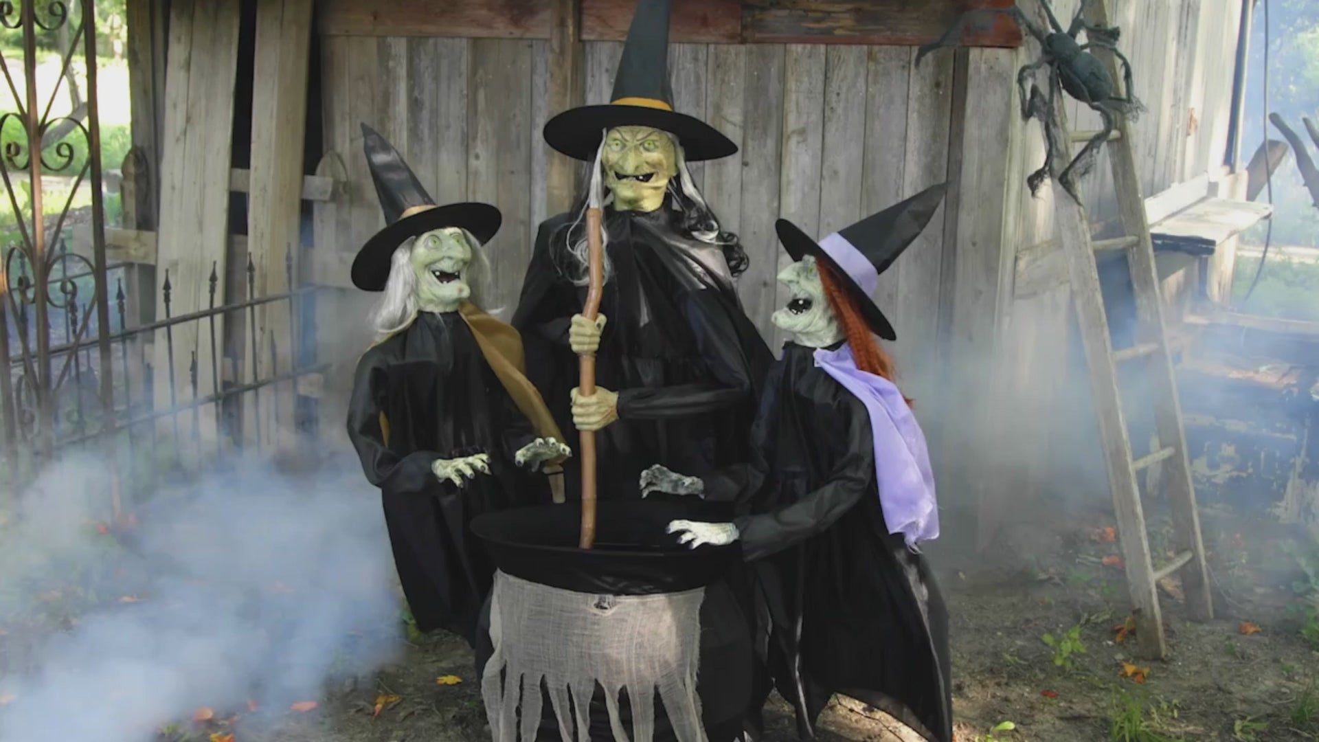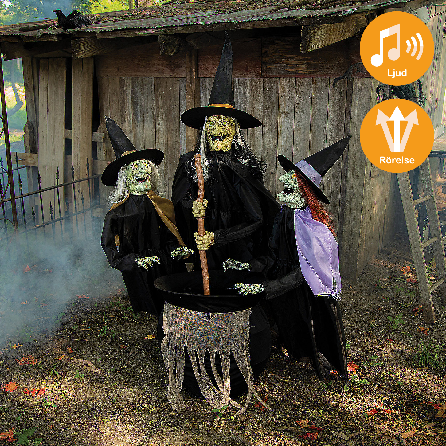 Tillkalla mörka fröjder med denna förtjusande häxtrio. Den är 1,5 meter hög och nästan 1,2 meter vid och kommer garanterat att dominera din hemsökta uppvisning med ondskefull charm och kusliga skratt!