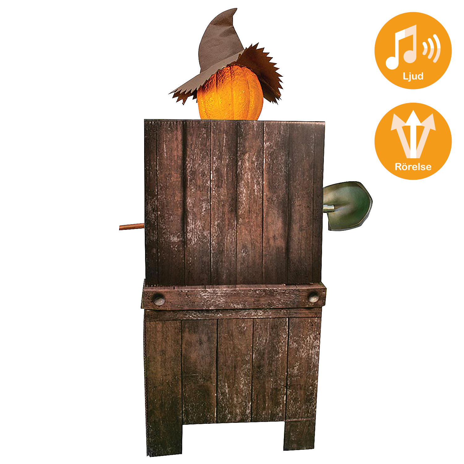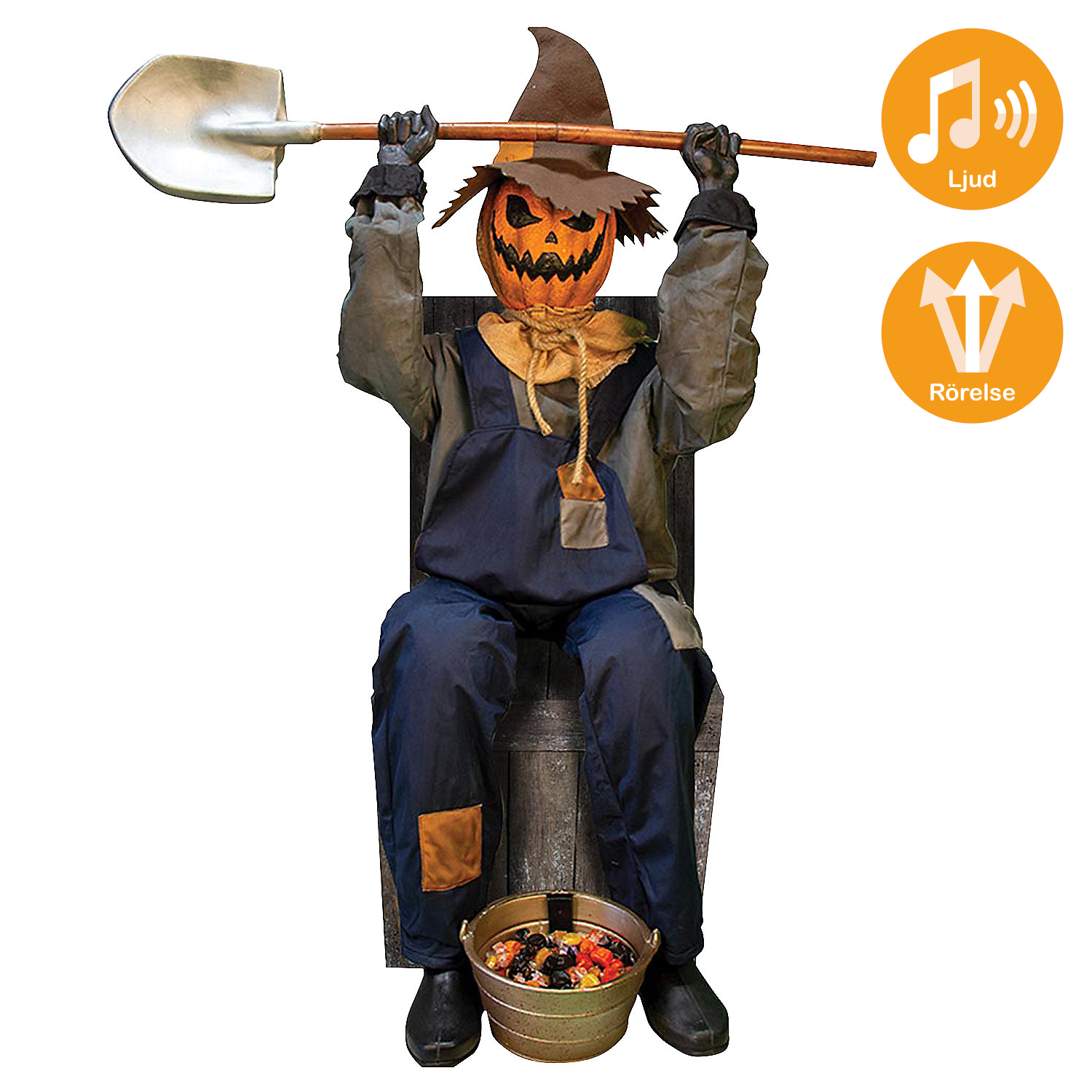 En stämningsfull och kuslig halloweenprop! Denna fågelskrämma sitter ner, håller i en spade och har en klassisk pumpa som huvud – en perfekt blandning av lantlig charm och skräck. Med sina slitna kläder och spöklika uttryck blir den en dekorativ detalj som passar lika bra på altanen som i hallen eller i festlokalen.