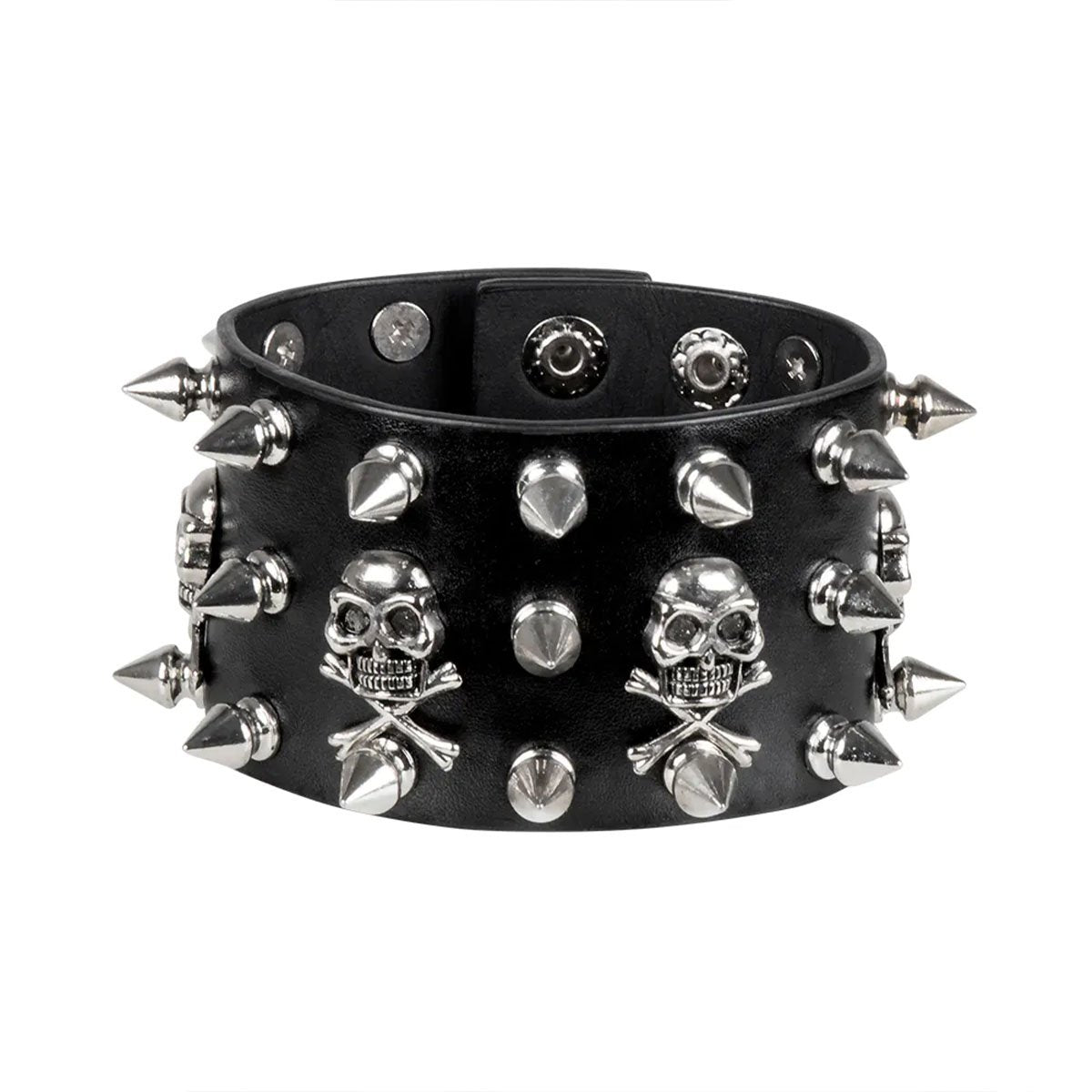 Sätt en tuff och rebellisk touch på din stil med vårt bikerarmband med dödskallar och nitar! Perfekt för rockkonserter, bikertemat eller varför inte gå på en riktig motorcykelträff. Komplettera med en tatueringsleeve när du vill visa din vilda sida. Detta breda armband i svart läderimitation är dekorerat med skinande metallnitar och dödskallar, vilket ger en riktigt rå och cool look.