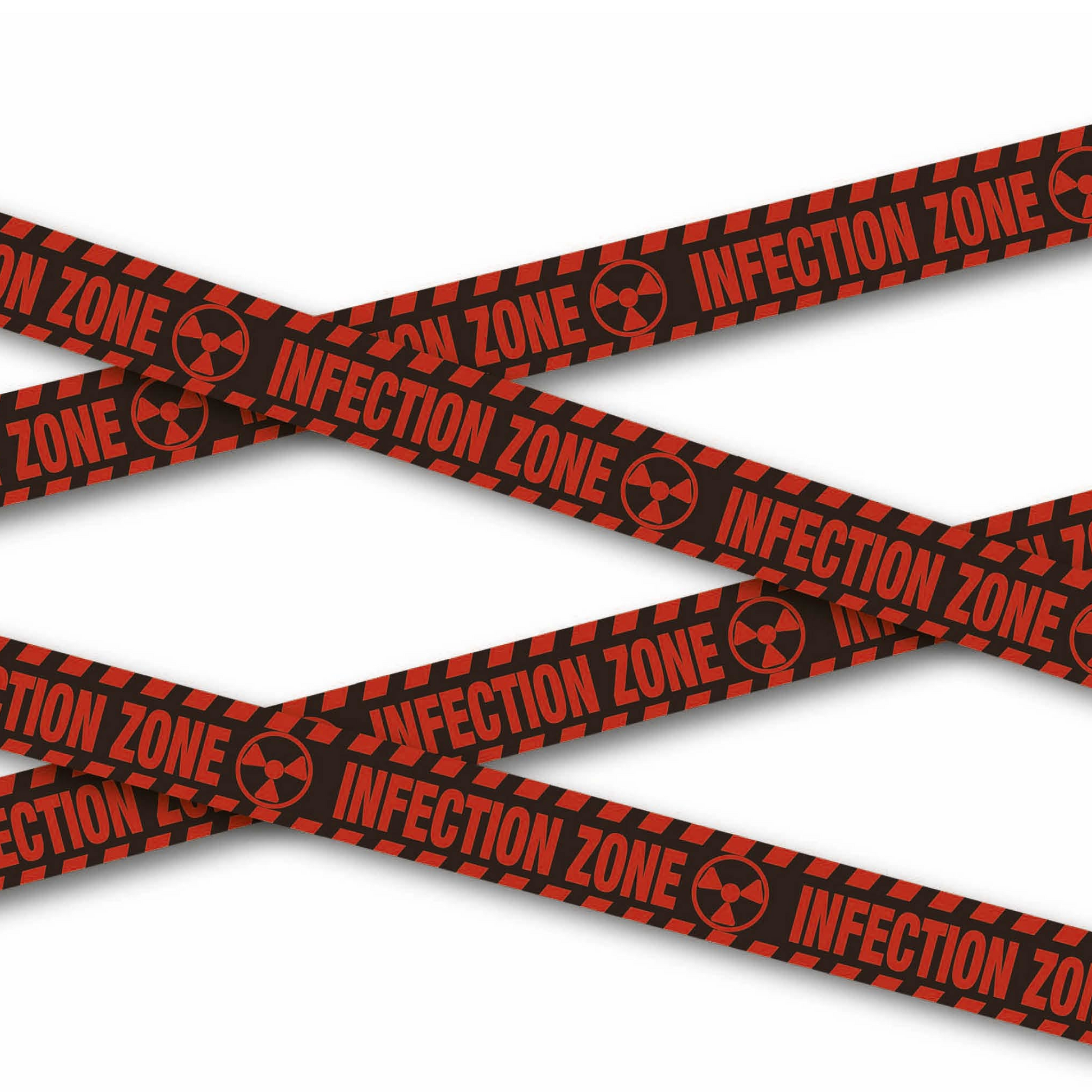 Tejpen är svart, prydd i rött med symbolen för radioaktiva ämnen och med texten "Infection Zone".