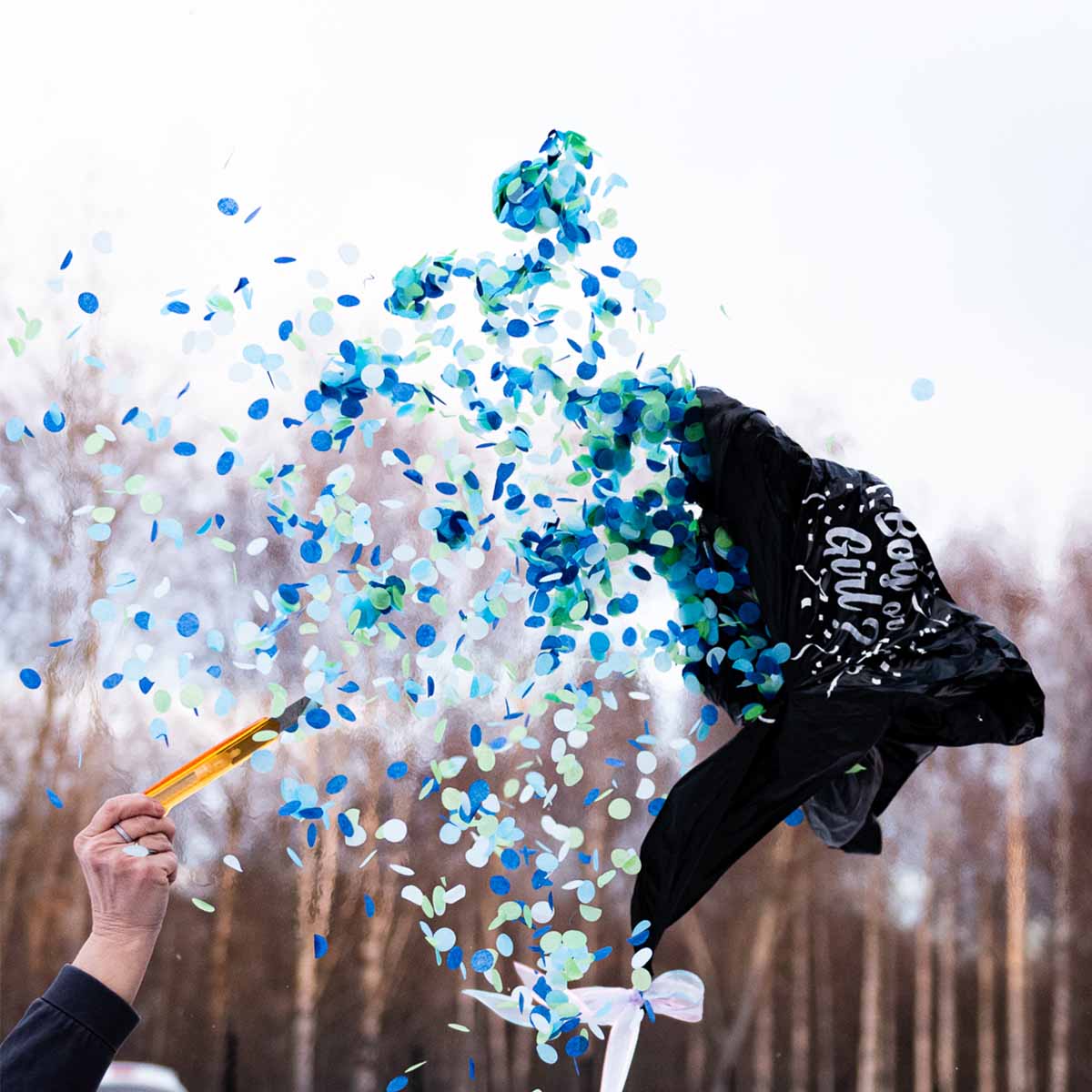 Har du bestämt dig för hur du ska avslöja bebisens kön på kommande baby shower? Gör det med den här ballongen, både spännande och roligt! Fyll ballongen med rosa/blå konfetti som medföljer, eller mixa båda färgerna. Fyll sedan ballongen med helium och knyt fast i ballongsnöre och en ballongvikt. Nu är det bara att samla gänget, ta fram nålen och poppa ballongen! Ut flödar rosa/blå papperskonfetti.