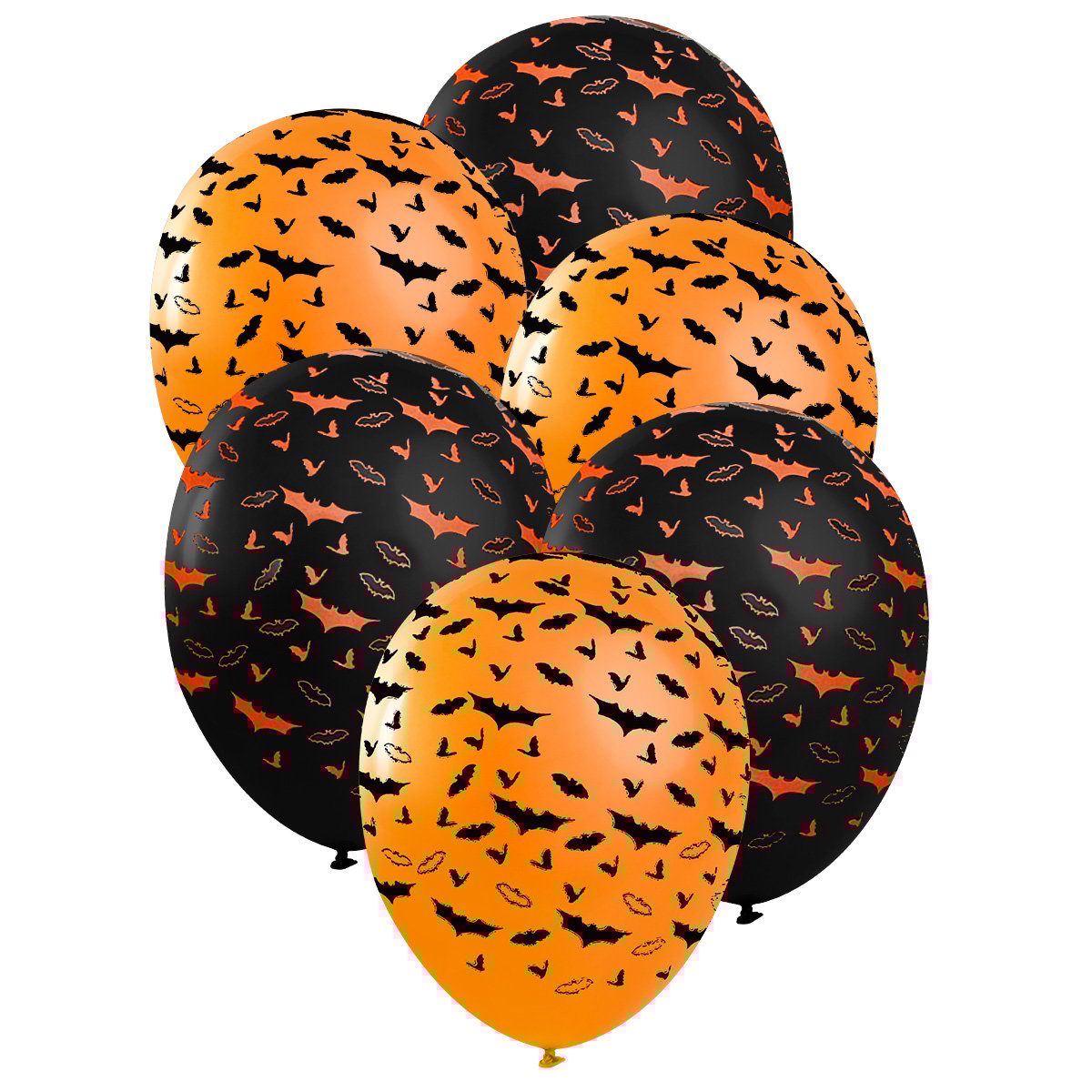 Klassiska gummiballonger i svart och orange med fladdermustryck. Perfekt för halloweenfesten eller spökfesten.