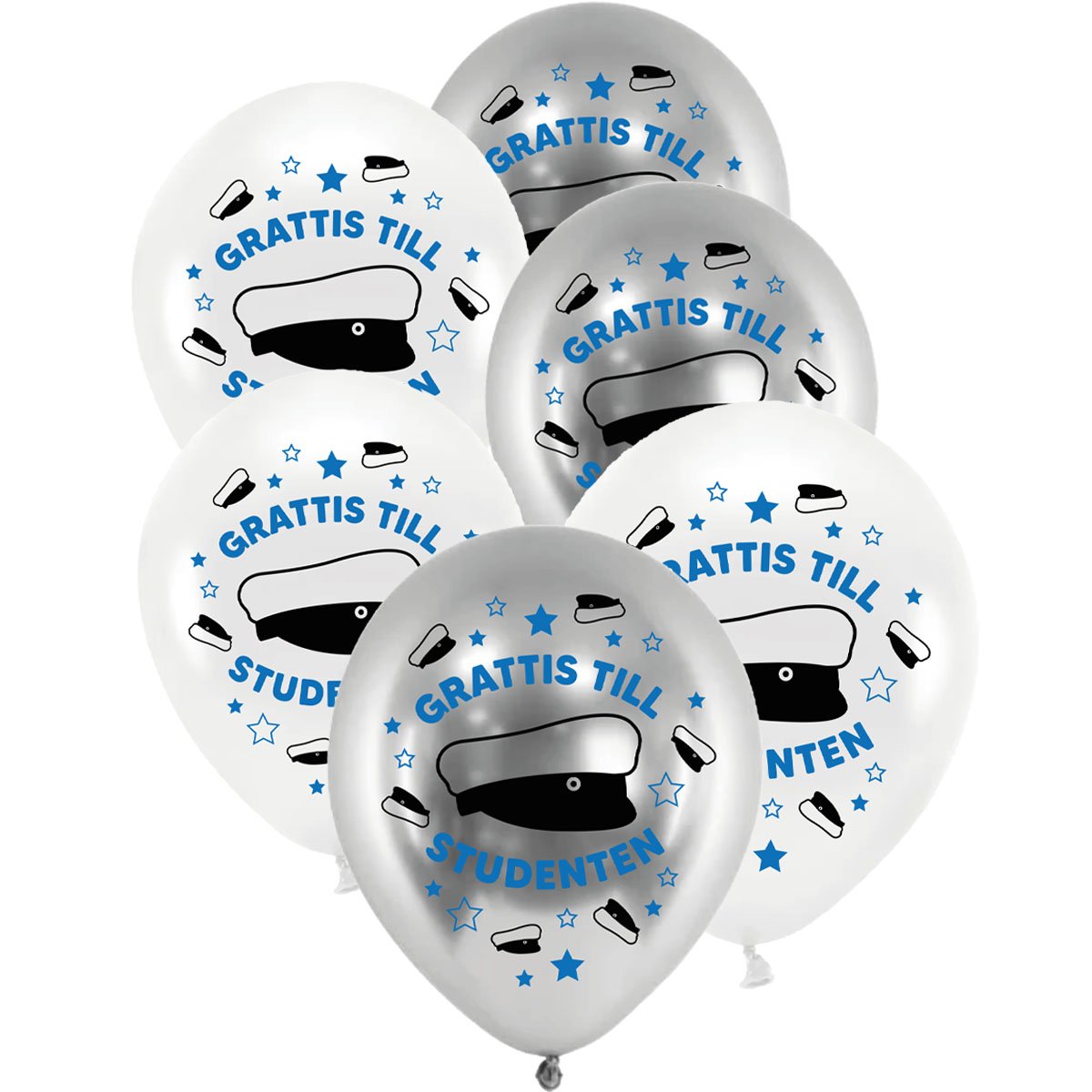 Fira studenten med dessa stilrena ballonger i vitt och silver! Med texten "Grattis till studenten" och motiv av studentmössor och stjärnor blir de en perfekt dekoration för mottagningen, flaket eller festlokalen.