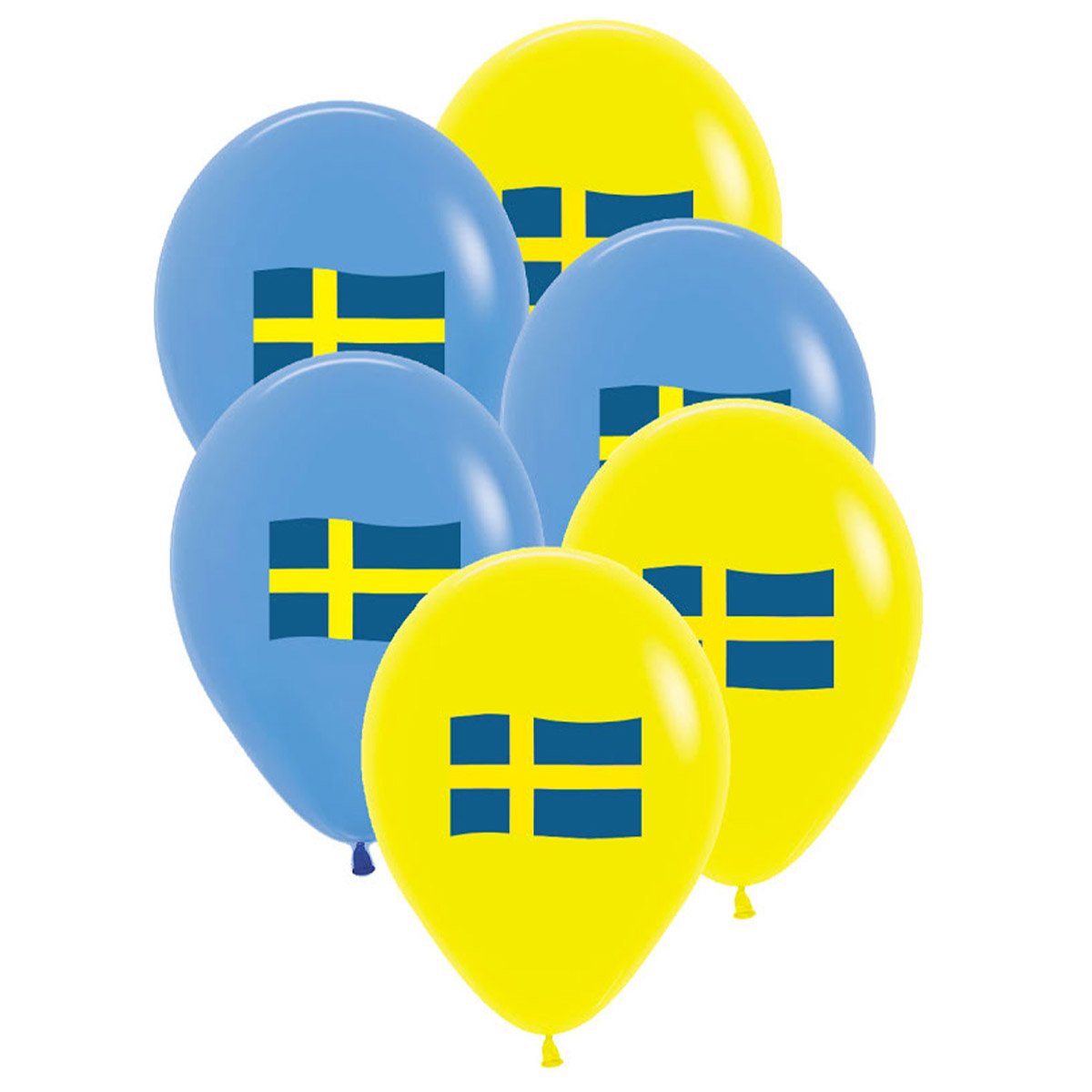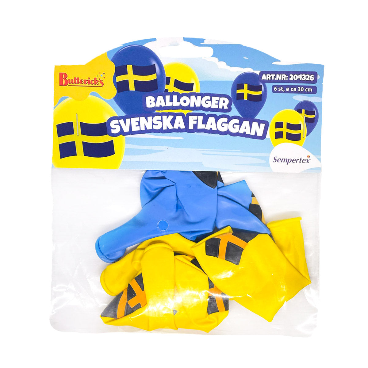 Varje förpackning innehåller 6 ballonger i blått och gult, med tydligt tryck av den svenska flaggan. De har en storlek på 30 cm och fungerar lika bra med luft som med helium.