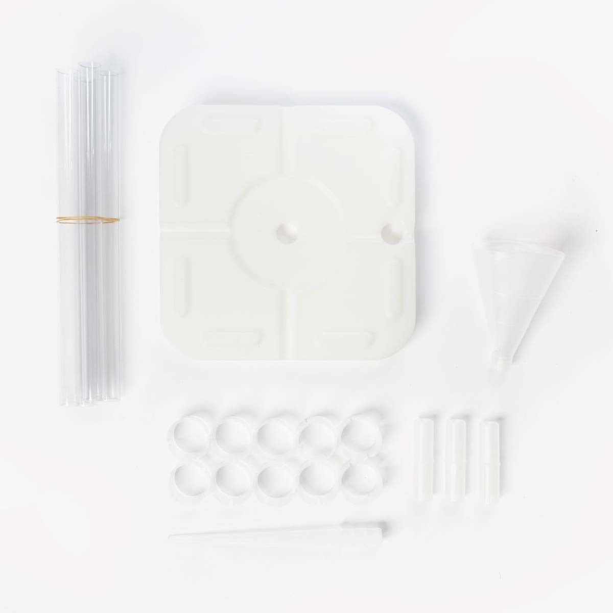 Innehåll i boxen: 1 kvadratisk vattenbas & 1 pinne (för att sätta fast i marken eller blomkruka), 4 rör på 30cm vardera, 3 kopplingar, 10 ballongringar, 1 hållare för XL ballong högst upp.