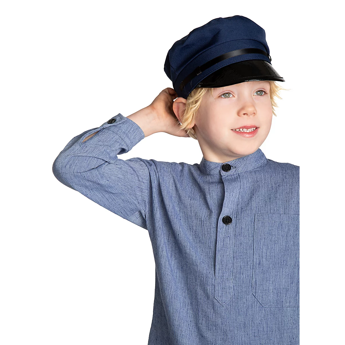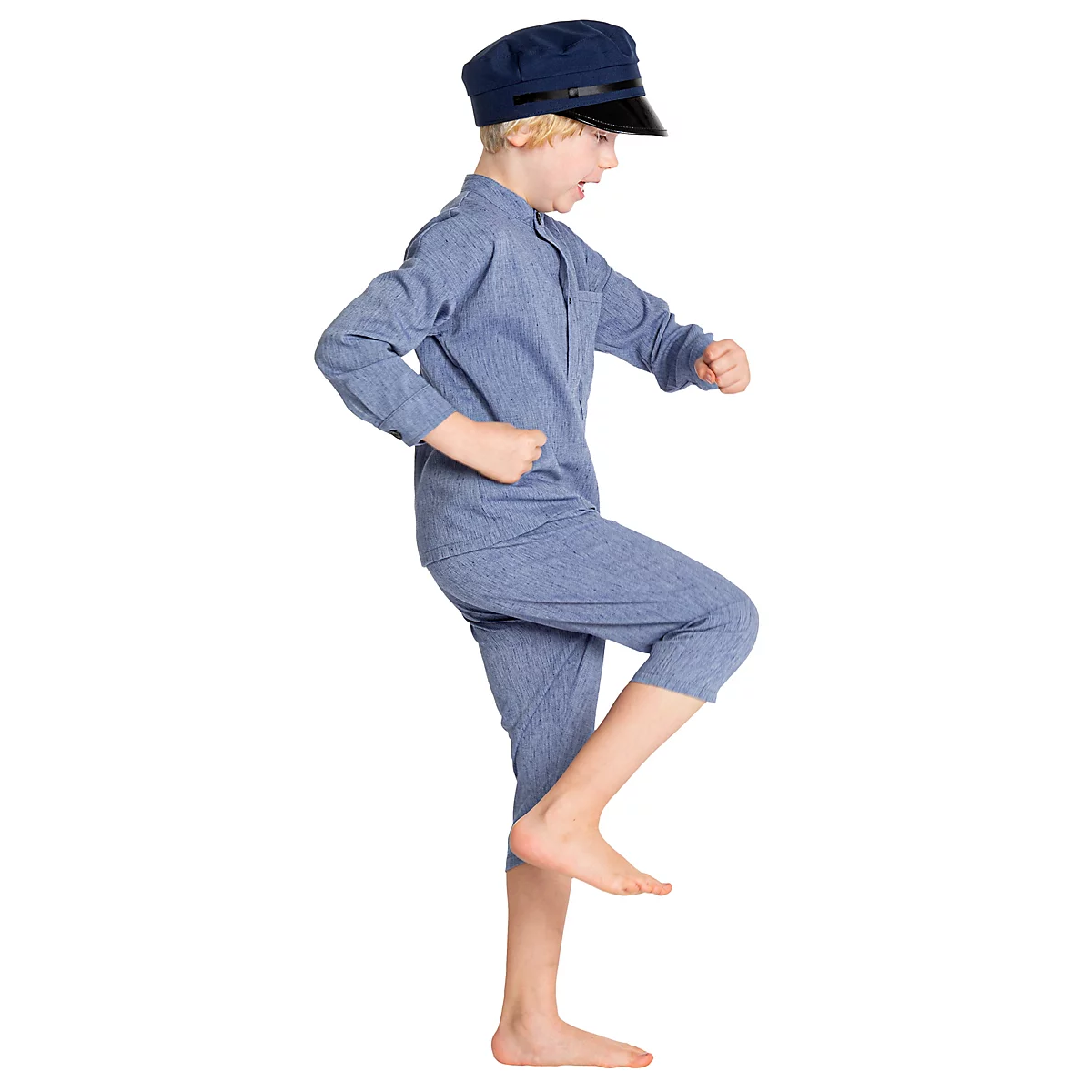 Den klassiska blå skjortan med knäppning framtill och matchande knälånga byxor ger den ikoniska Emil-looken. Den medföljande blå kepsen fulländar stilen och gör det enkelt att känna igen den älskade karaktären från de småländska äventyren.