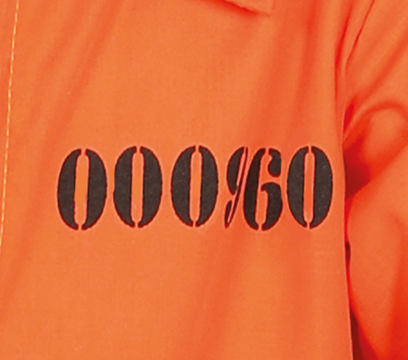 Inkluderar en orange jumpsuit med blixtlås fram och ett nummer på bröstet.