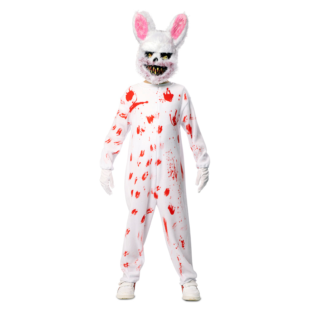 Förvandla ditt barn till påskens mardröm med denna blodiga zombiekanin-dräkt! Dräkten består av en helkroppsoverall i vitt, täckt av realistiska blodfläckar och röda handavtryck som skapar en skrämmande effekt. Den groteska kaninmasken med spetsiga tänder, stirrande ögon och fluffiga öron ger ett obehagligt intryck – perfekt för Halloween, skräcktema eller maskerader. Den här dräkten är både obehaglig och oförglömlig, och garanterar att ditt barn blir festens mest skräckinjagande kanin.