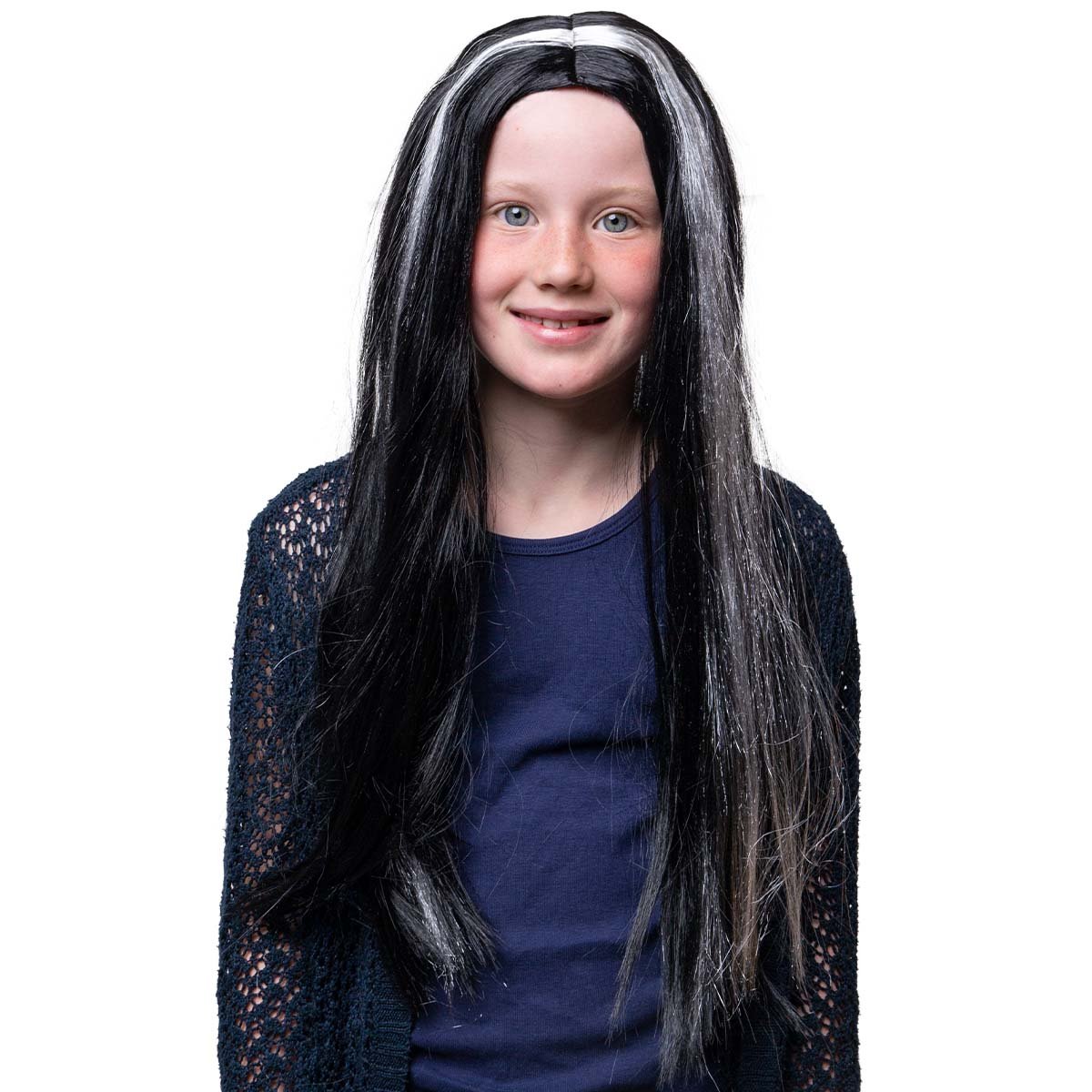 Låt ditt barn förvandlas till den mest stilfulla häxan i grannskapet med denna långa svarta peruk med mystiska vita slingor. Oavsett om det är Halloween, maskerad eller en egen magisk show i vardagsrummet, är denna peruk den perfekta accessoaren för att skapa en oförglömlig look.