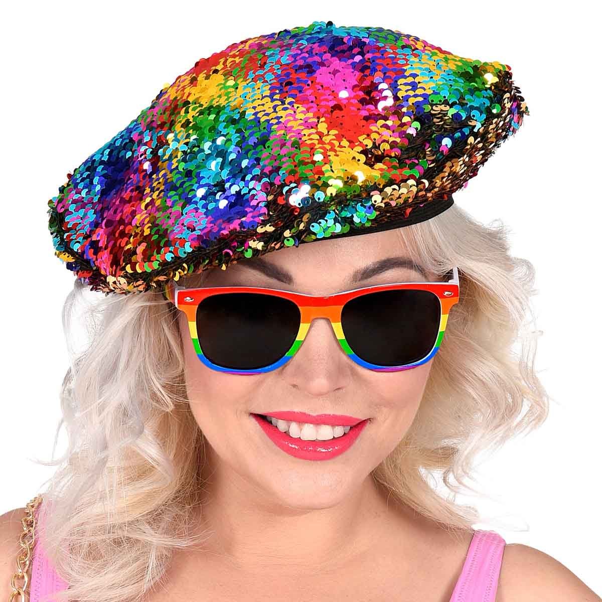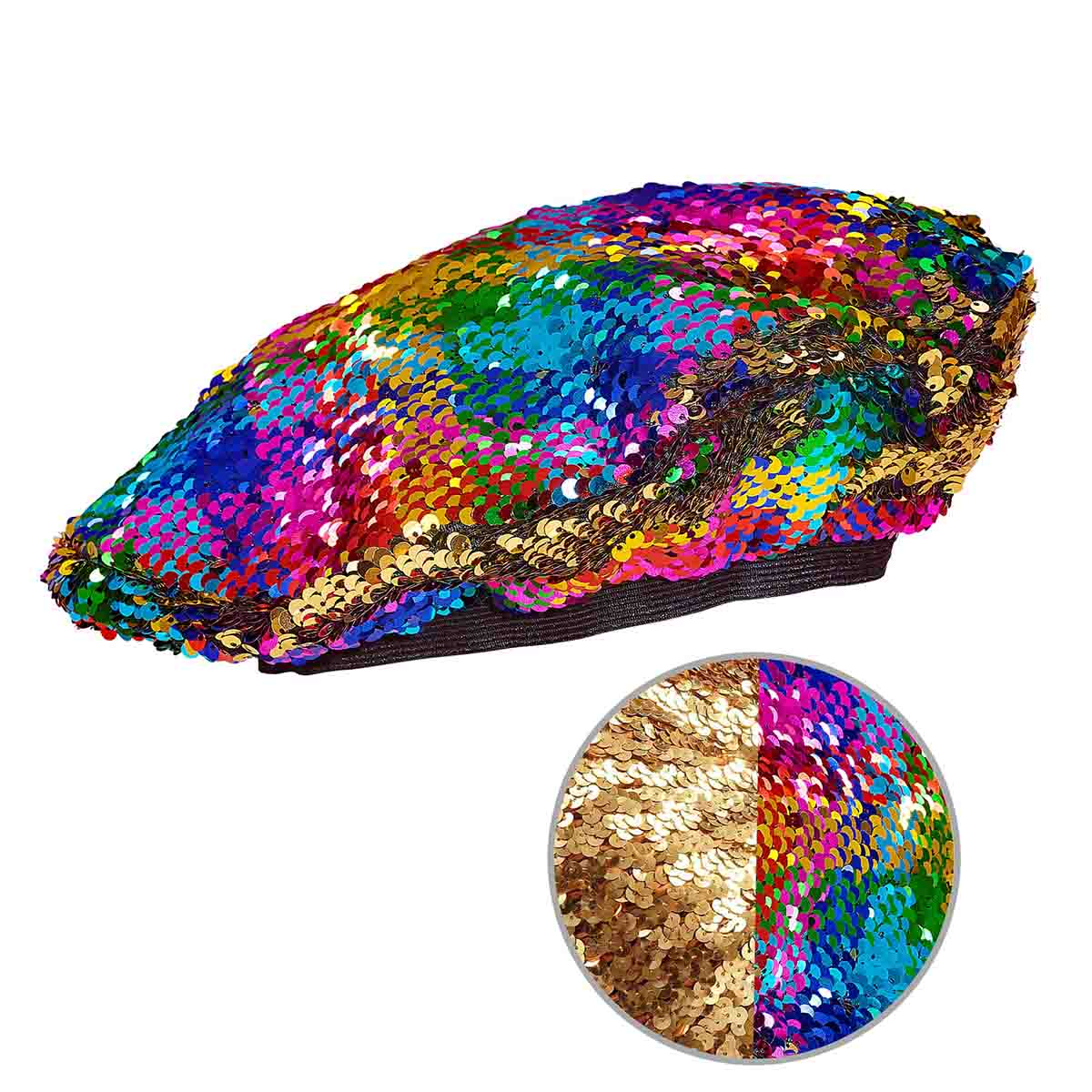 Kom till sommarfestivalen med en snygg glittrig basker i guld eller regnbåge! Denna härliga basker har vändbara paljetter som gör att du kan använda baskern till massor av olika teman och fester.