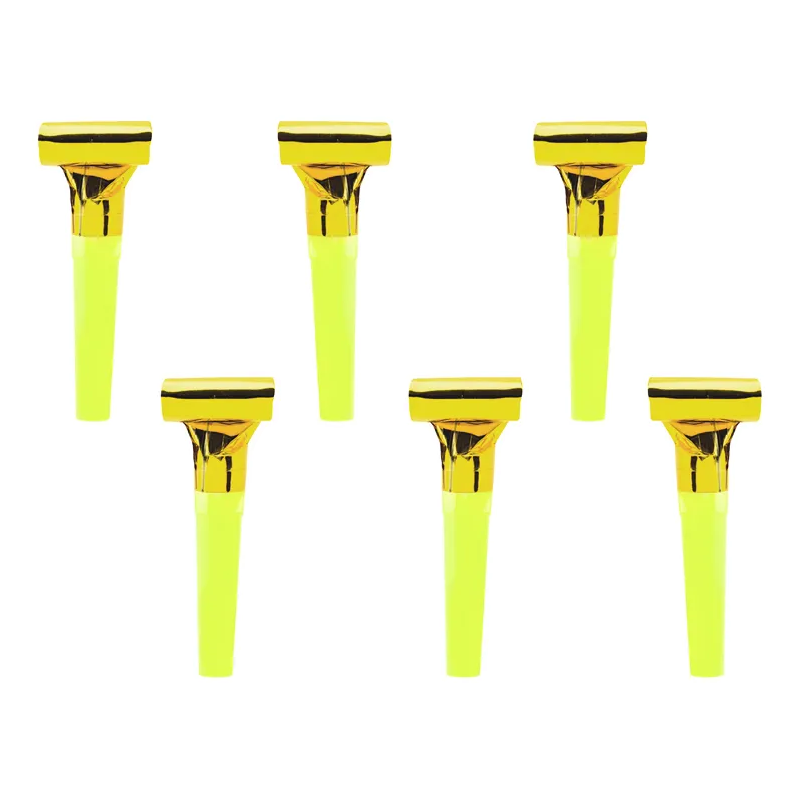 När man blåser i dem rullas pappersdelen ut och ger ifrån sig ett roligt ljud, vilket gör dem till en uppskattad detalj för både barn och vuxna. Kombinationen av guld och neon ger en lekfull och festlig känsla.