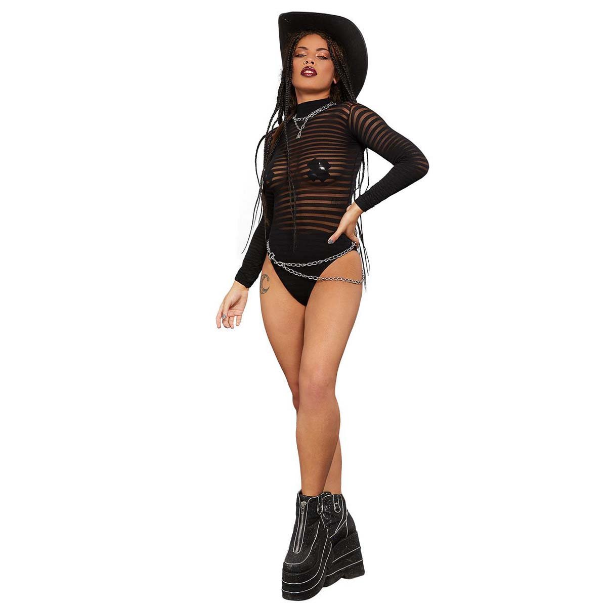 Underkläder och nipplecover ingår ej, men det går utmärkt att matcha med dina egna underkläder hemma för att få till en snygg look på festen, matcha med starka färger eller svart.