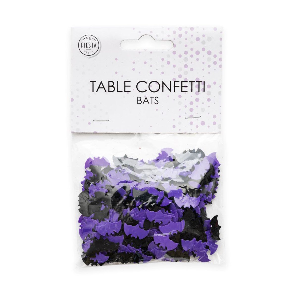 Bordskonfetti i form av lila och svarta fladdermöss.