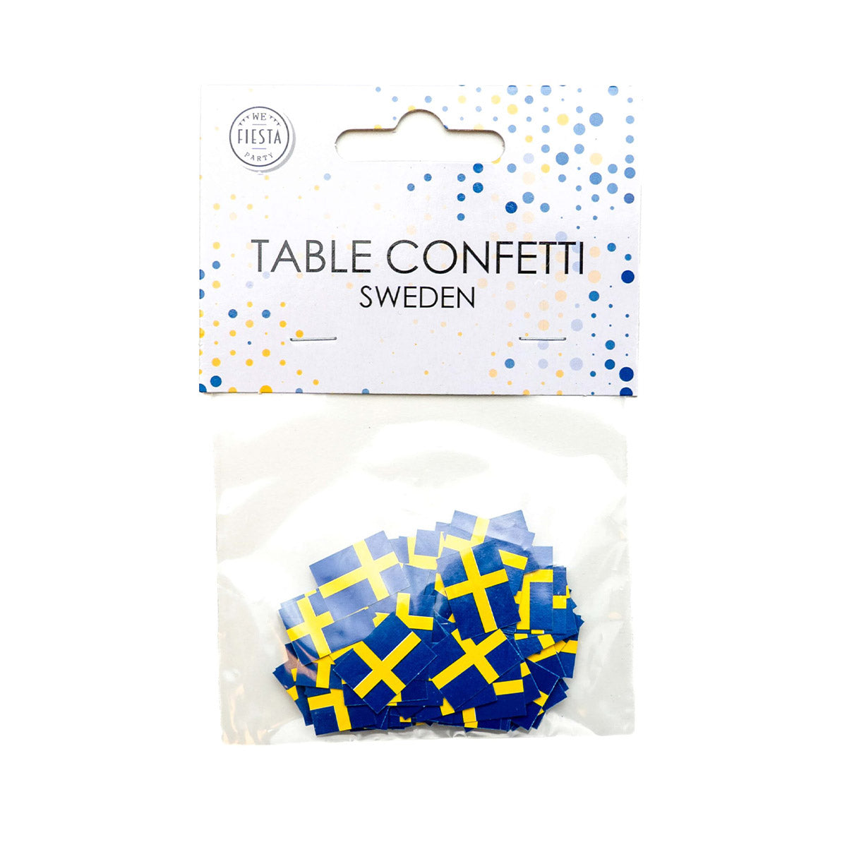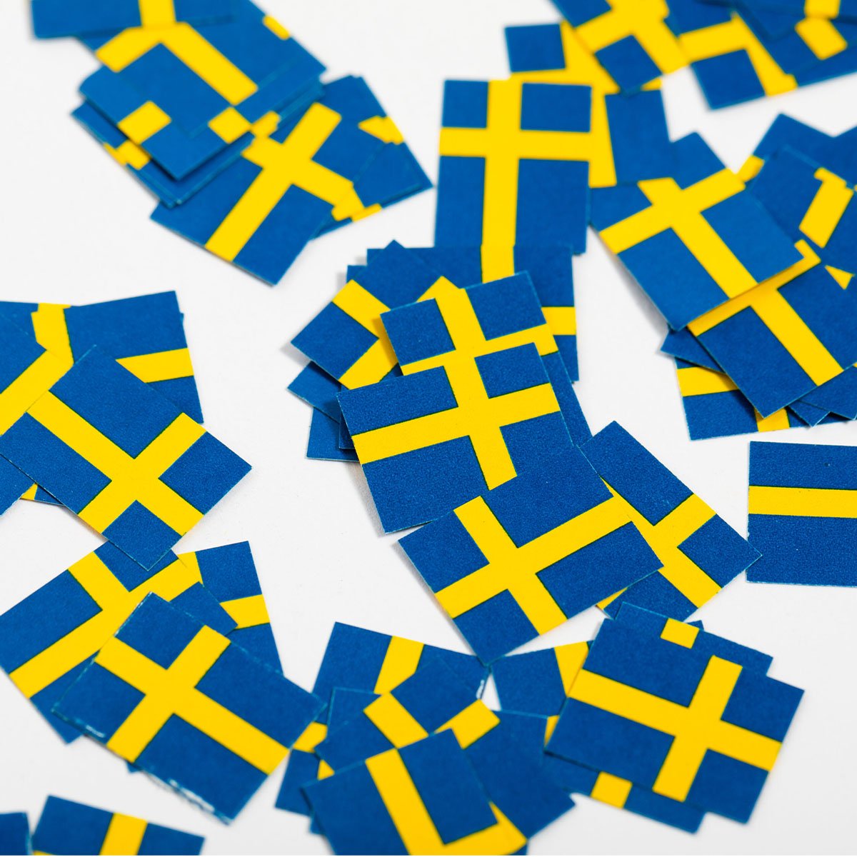 Låt festen gå i blågult med Bordskonfetti i papper, Sverige 150 st – ett enkelt men effektfullt sätt att förstärka stämningen vid varje svensk högtid. Dessa små konfettibitar föreställer den svenska flaggan och passar perfekt till dukningen på nationaldagen, midsommar, studenten eller kanske till en hejdundrande Eurovision-kväll?