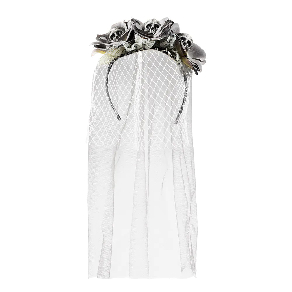 Denna skrämmande huvudbonad med dödskallar och blommor är perfekt för en Halloweenlook med en gotisk och kuslig twist. De svarta rosorna och små dödskallarna på tiaran tillsammans med den eleganta vita slöjan ger ett skrämmande, men samtidigt vackert utseende. Denna accessoar är idealisk för zombiebrud- eller dödsbrudkostymer, eller för en mystisk och mörk look på en spökhusfest.