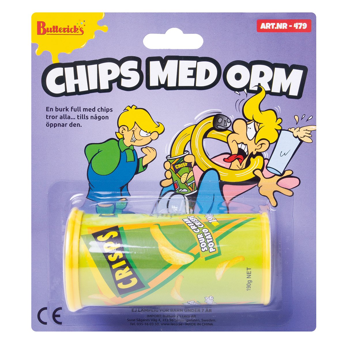 Ett chipsrör som innehåller en chipsorm som flyger rakt ut i den chips-sugnes ansikte. Man kommer hoppa till ordentligt när innehållets orm hoppar upp. Riktigt rolig att bjuda på under släktmiddagen eller på lördagskvällen. Ställ den i skåpet och se hur lång tid det tar innan någon i familjen inte kan motstå frestelsen att äta och de lär sig sin läxa direkt med en chipsorm.