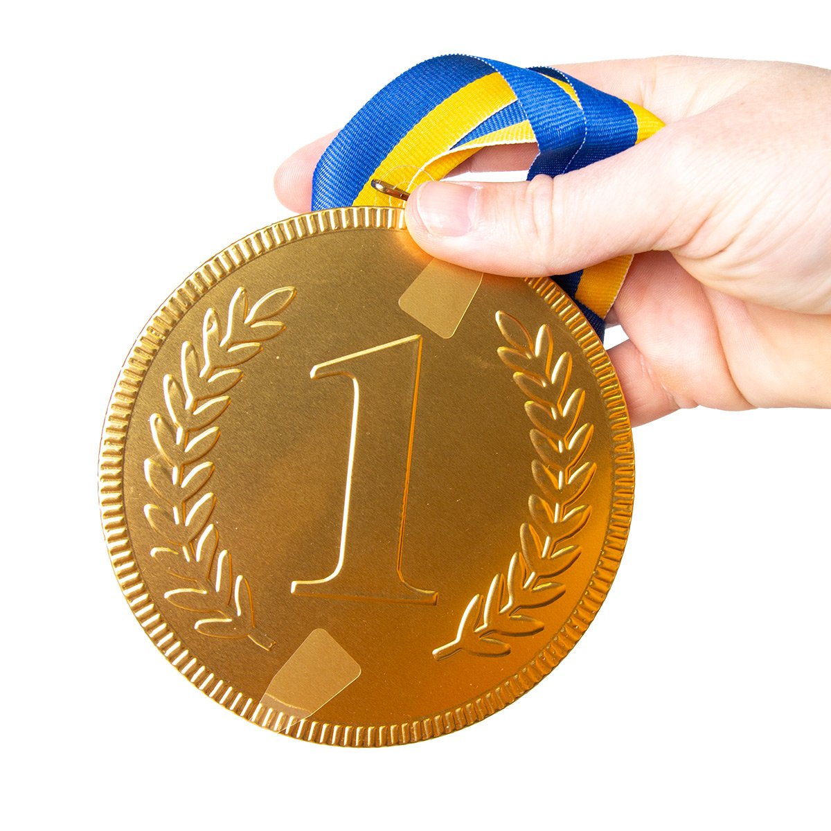 Choklad som är täckt av guld & hänger i ett blå/gult snöre. Perfekt att ge bort en chokladmedalj till någon du tycker förtjänar en etta eller köp till jobbet och dra igång en 5-kamp! En bra accessoar till det mesta.