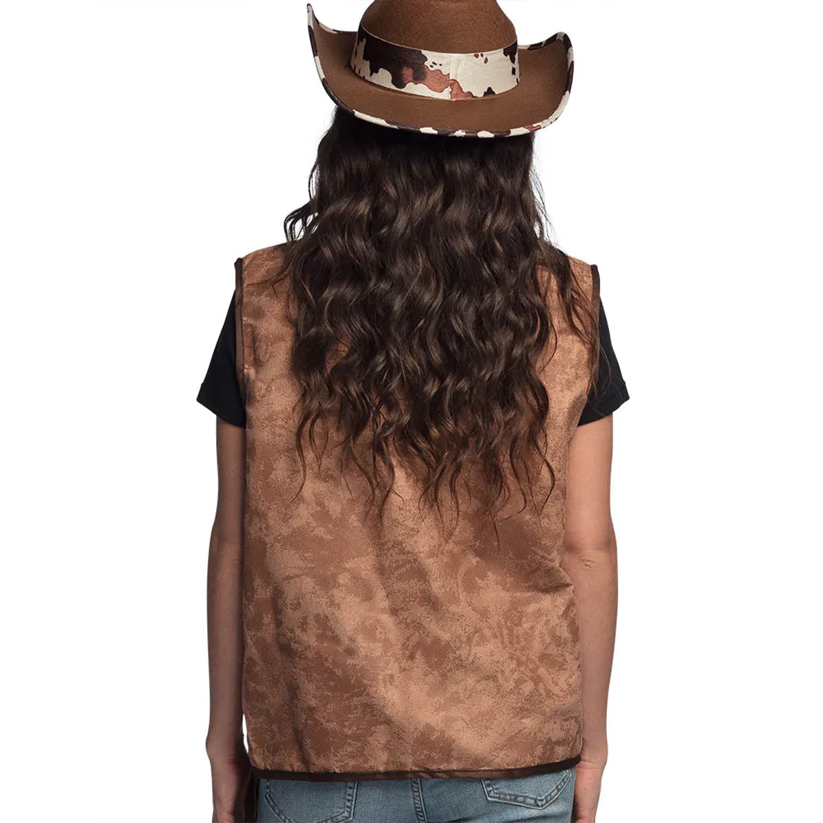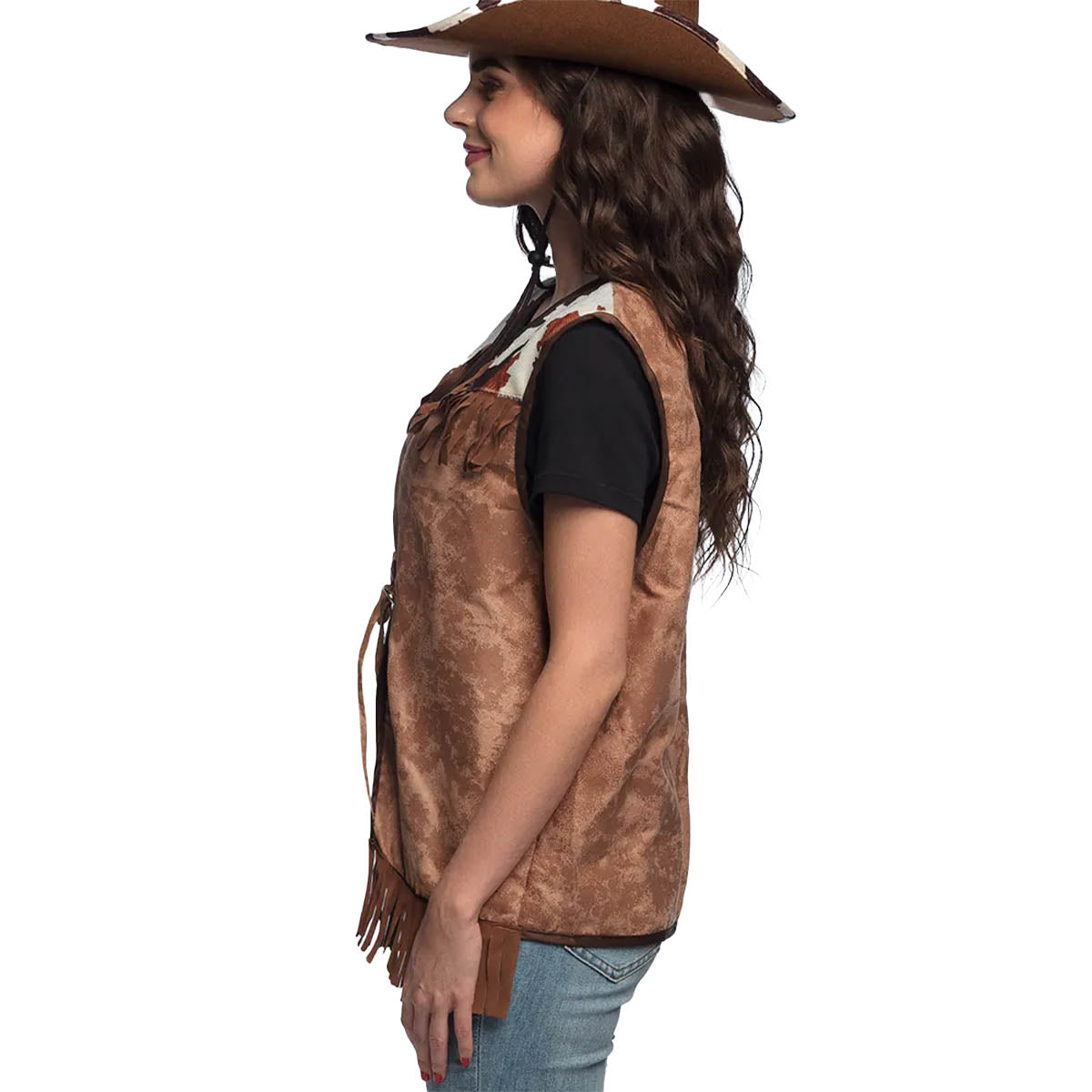 Kliv in i rollen som en äkta westernhjälte med denna bruna cowboyväst! Västen har en autentisk design med mockaliknande textur, fransar och detaljer i koskinnsmönster som för tankarna till Vilda Västerns öppna vidder. Perfekt för temafester, maskerader eller när du bara vill sätta en unik prägel på din outfit. Den är enkel att bära över en skjorta eller t-shirt och knyts framtill för att hålla den på plats under kvällens alla äventyr.