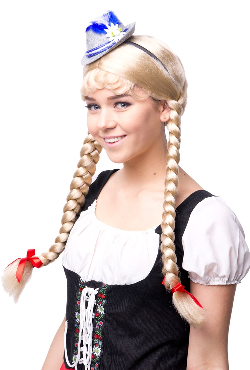 Liten grå hatt på diadem med vita och blå detaljer samt fjädrar. Perfekt för oktoberfesten.