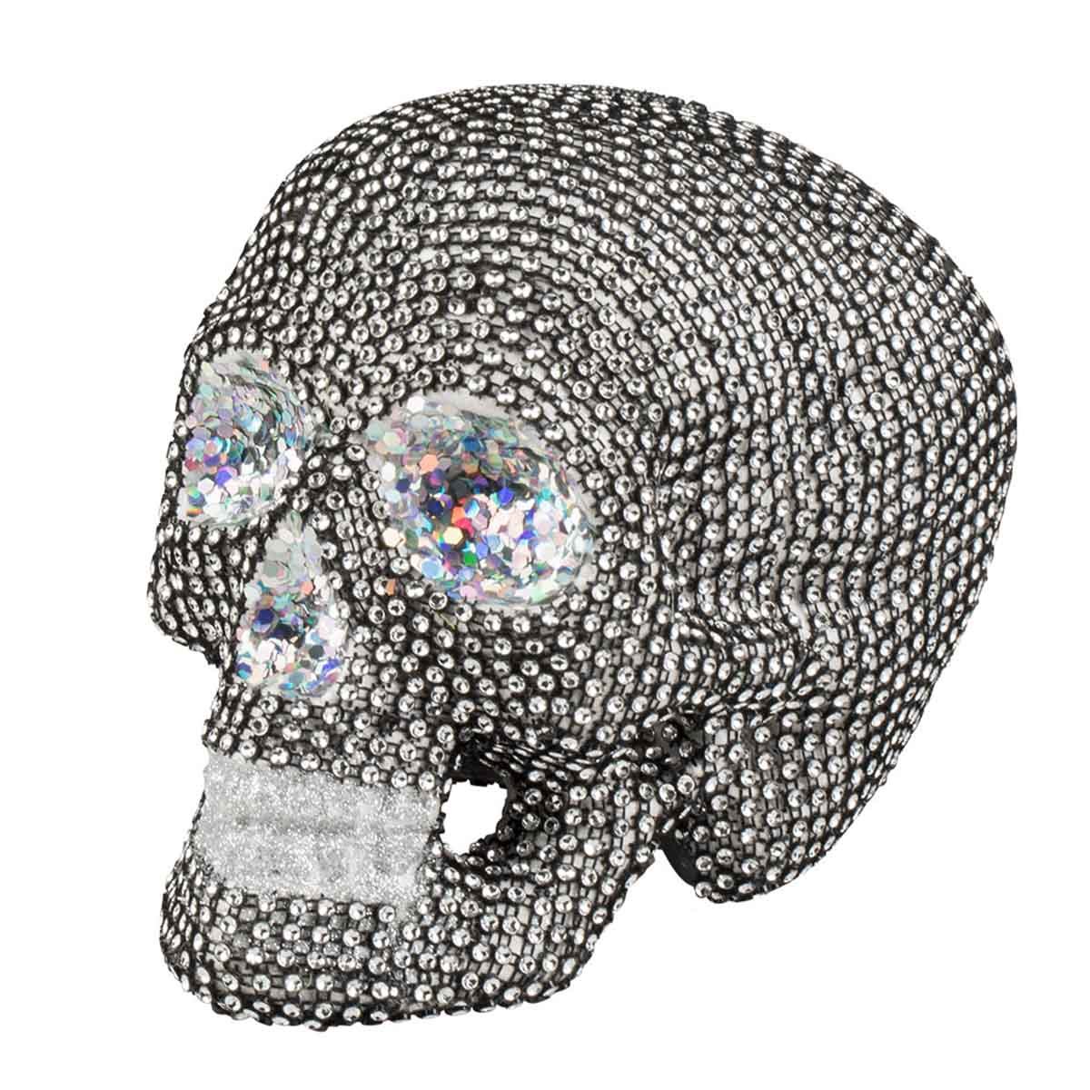 Ta din festdekor till en ny nivå av extravagans med denna glittrande strass- och diamantklädda dödskalle. Denna dödskalle är inte bara en dekoration, den är ett konstverk, som med sina bländande stora ädelstenar för ögon och näsa samt en gnistrande glittermun, blir en oemotståndlig centrumpunkt i varje rum.