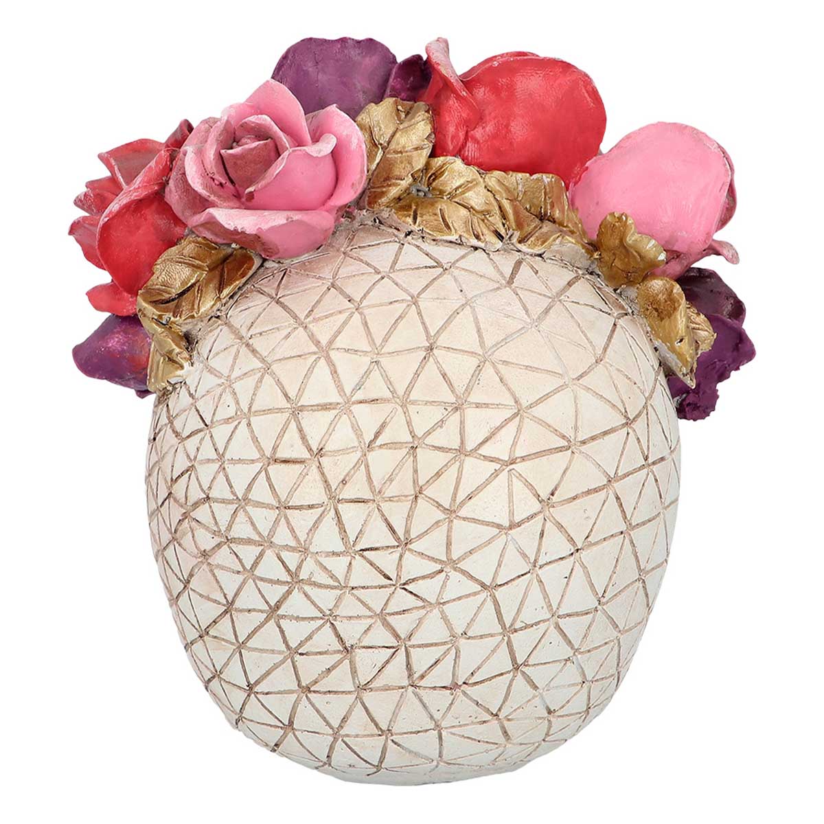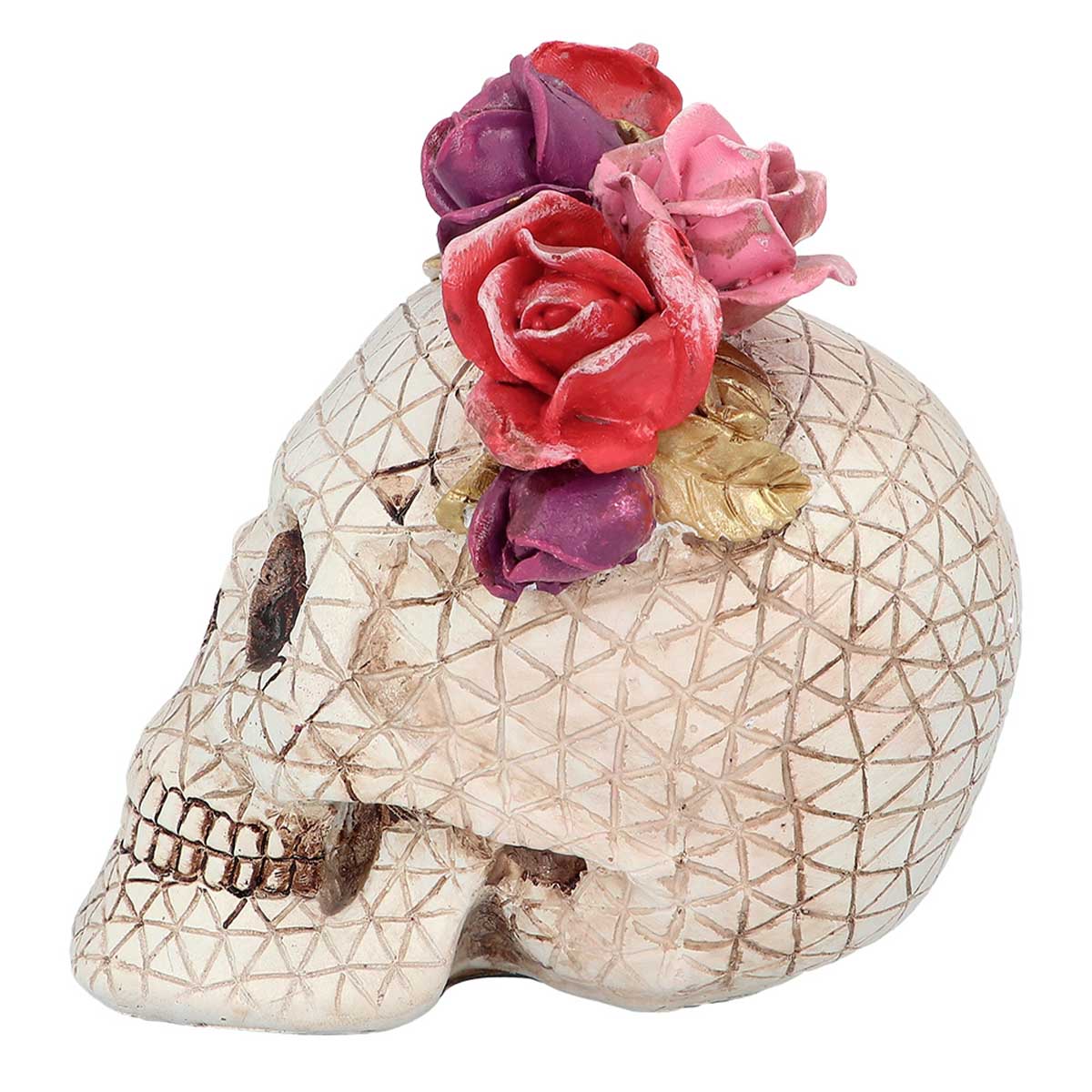 Denna vackra dödskalle är den perfekta prydnaden för din Day of the dead-temafest eller Halloweenfirande. Med sina intrikata detaljer och färgglada blomsterkrans är denna dödskalle tillräckligt stilfull för att ha framme året om. Dödskallen mäter 15x14x15 cm och är tillverkad av hållbar och högkvalitativ resin. Dess design inkluderar ett elegant diamantmönster och en färgglad blomsterkrans i nyanser av rosa, rött och lila.