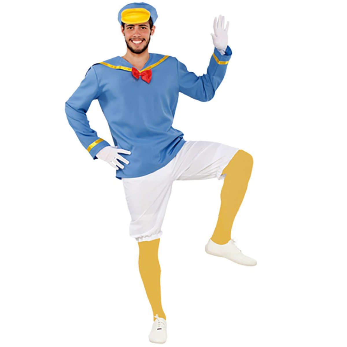 Dräkten inkluderar blå långärmad topp med gula detaljer, vit fluga och tillhörande byxor med gula ”ankben” som ger illusionen av fjäderbeklädda ben. Den klassiska ankhatten med gul skärm fullbordar looken. Perfekt för dig som vill skoja till det rejält på temafesten, barnkalaset eller maskeradkvällen.