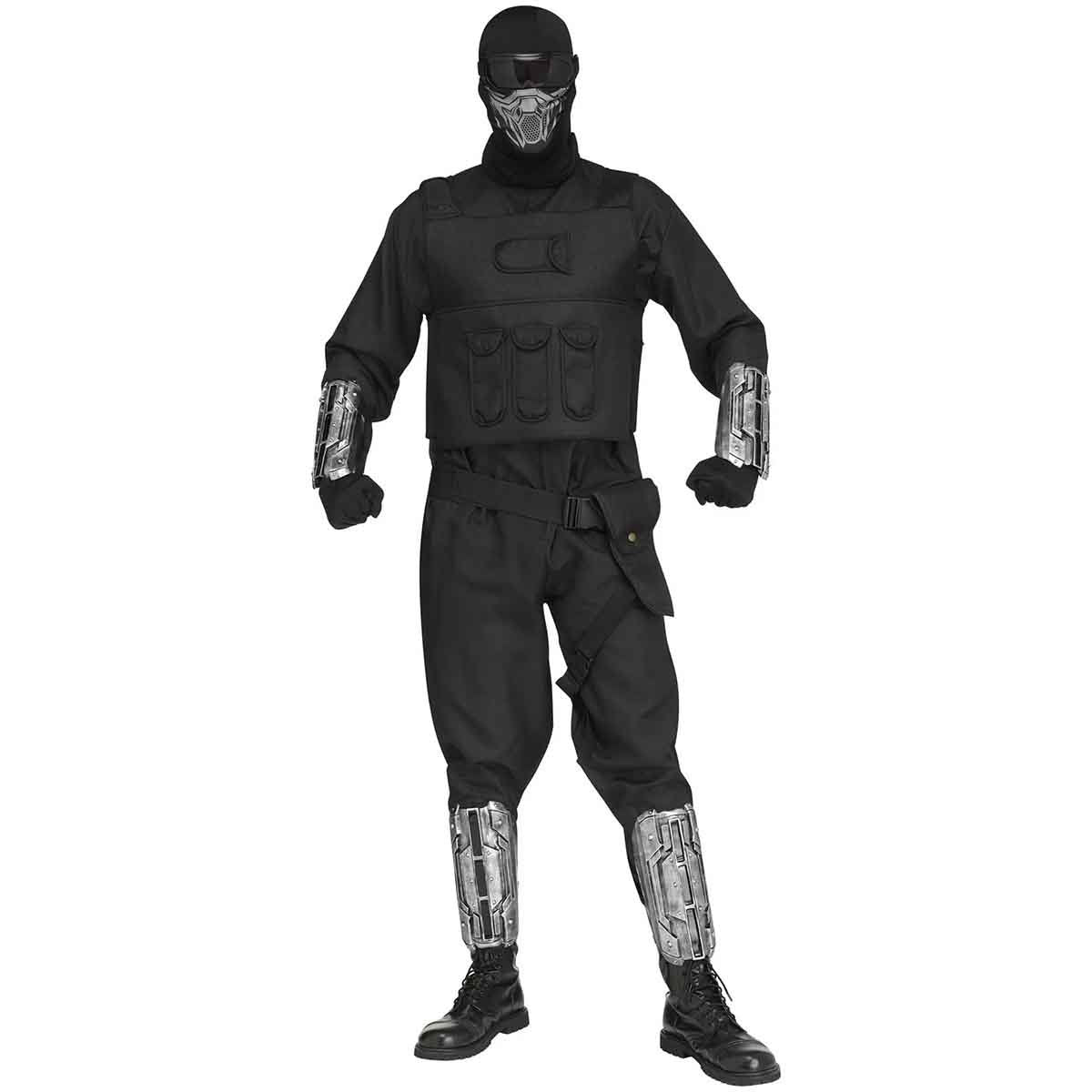 Innehåller: Svart jumpsuit, huva, glasögon, väst, handskar, bälte med hölster, arm- och benskydd.