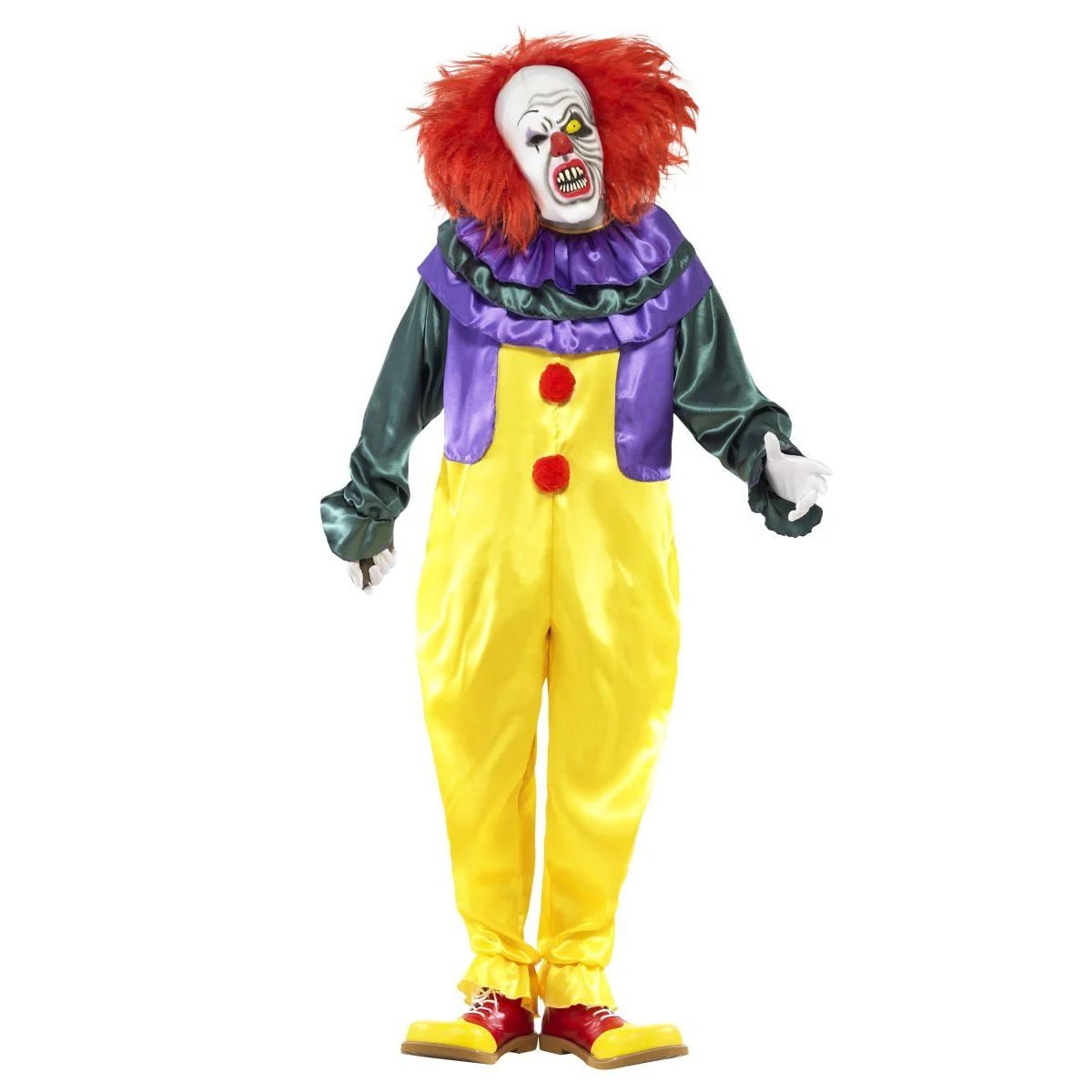 Ge dina gäster kalla kårar med denna skrämmande clowndräkt med mask - "Classic horror" från Smiffys! Klä ut dig till den ultimata skräckclownen och bli festens mest oförglömliga varelse. Denna dräkt är komplett med en färgglad jumpsuit i klara nyanser av gult, lila och grönt, samt en detaljrik mask med vilt rött hår som garanterar att ingen undgår ditt läskiga utseende. De stora röda knapparna och den voluminösa kragen ger dräkten ett lekfullt men samtidigt hotfullt uttryck.