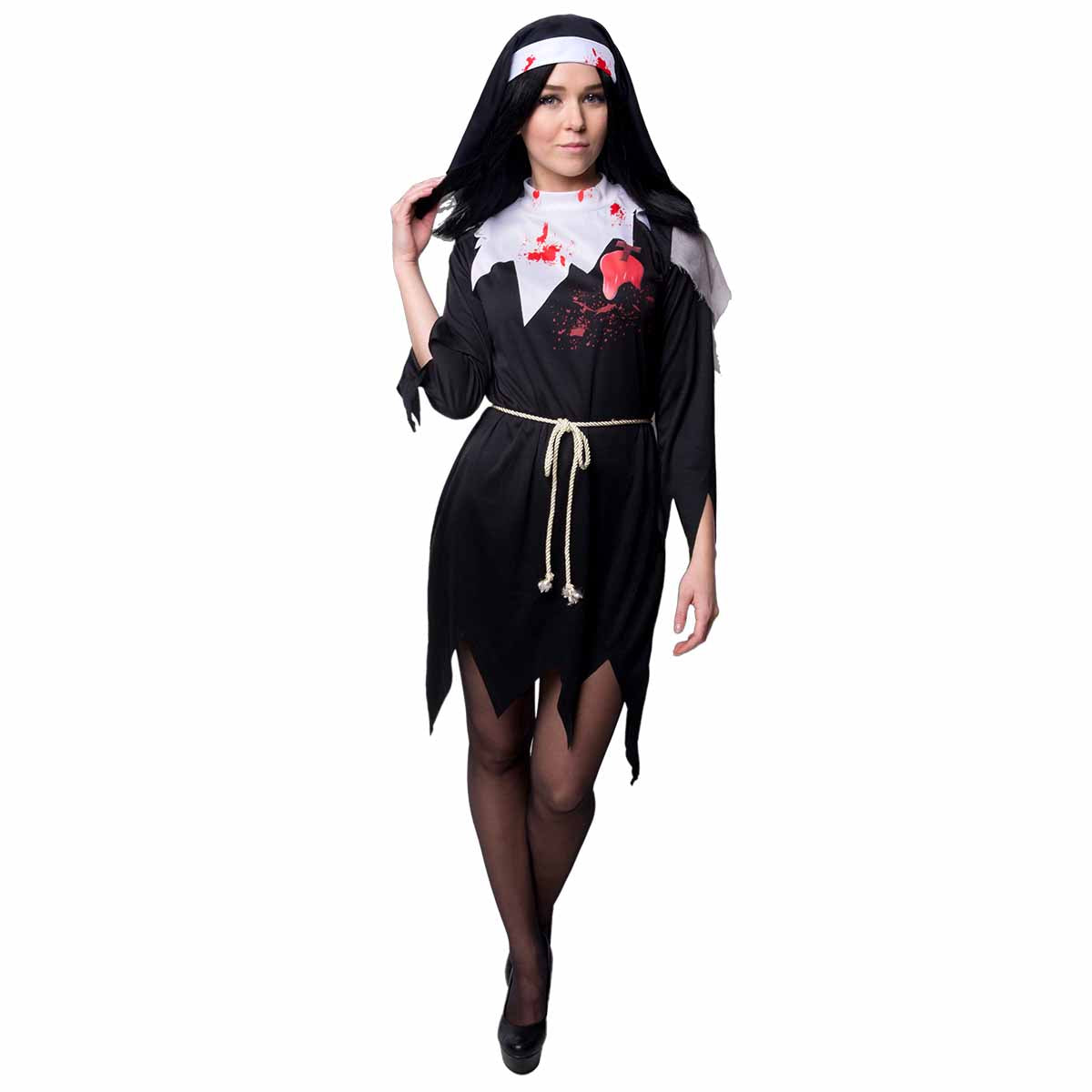 För att förstärka ditt skräckinjagande utseende ytterligare, glöm inte att komplettera din dräkt med ett par slående svarta stay-ups och ett förföriskt guldkors. Vare sig du deltar i en Halloween-fest, maskerad eller annan temafest, kommer den här blodiga nunnedräkten garanterat att stjäla rampljuset och framkalla gaspningar (och kanske några skrik) från mängden!