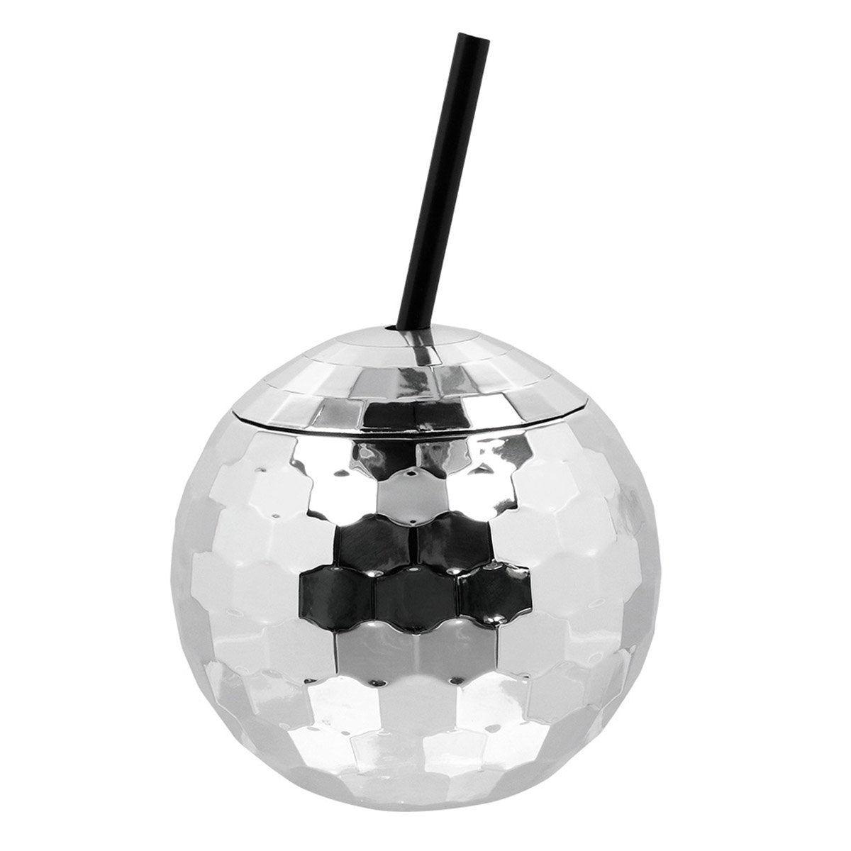 Drinkglaset discoboll silver med sugrör är i plast och rekommenderas att handdiska.