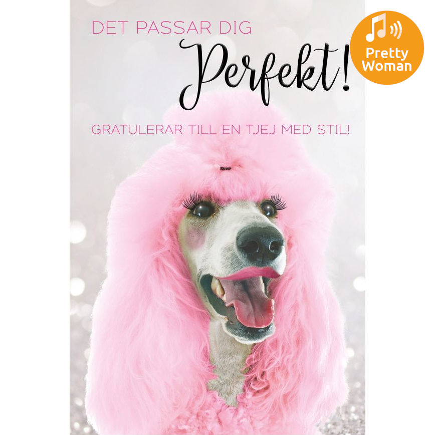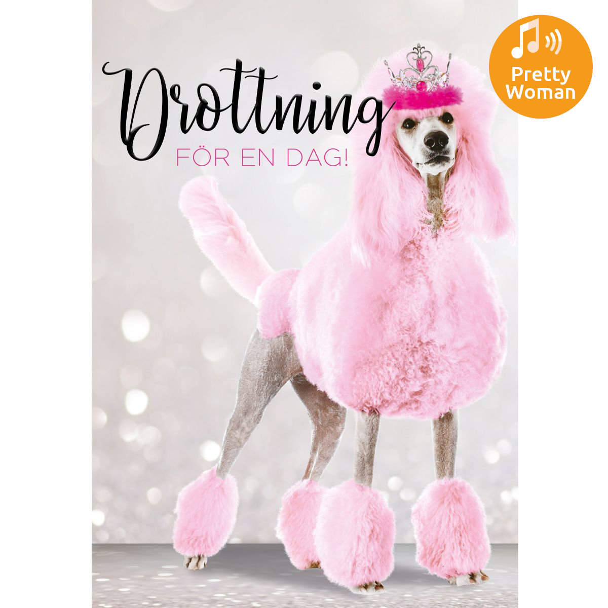 Ett glamoröst och lekfullt gratulationskort som verkligen får mottagaren att känna sig som en stjärna. När kortet öppnas spelas låten Pretty Woman, vilket direkt skapar en känsla av glamour, självsäkerhet och fest. Det stilfulla motivet med den rosa, kungligt klädda hunden ger kortet en humoristisk men samtidigt elegant touch som passar perfekt till någon som förtjänar att stå i centrum.