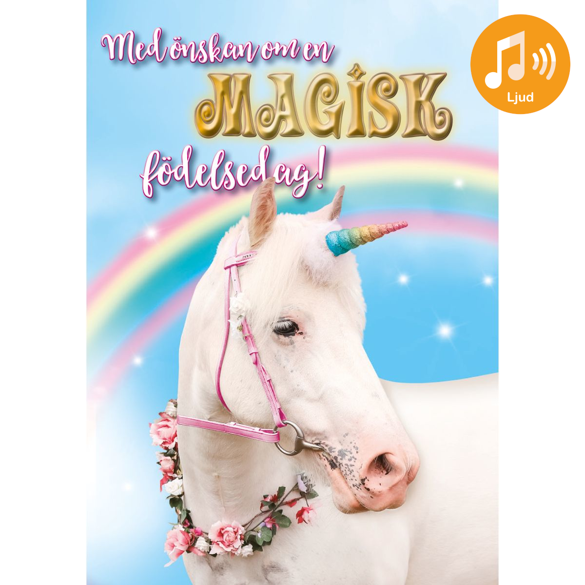 Ett förtrollande födelsedagskort som bjuder på en magisk överraskning redan när det öppnas. Direkt när mottagaren viker upp kortet spelas glad och stämningsfull musik som förstärker känslan av firande och gör ögonblicket minnesvärt. Det sagolika enhörningsmotivet med regnbåge och gnistrande detaljer ger kortet ett lekfullt och drömmigt uttryck som passar perfekt till barn, enhörningsälskare och alla som uppskattar något extra speciellt.