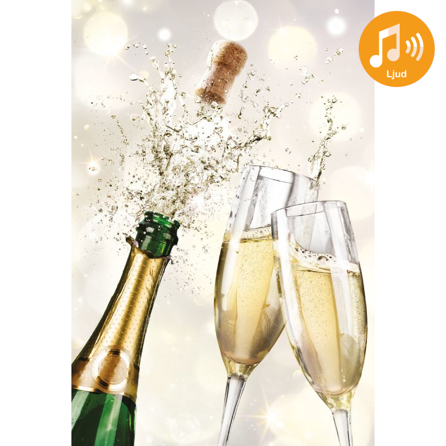 Ett elegant och festligt gratulationskort som förhöjer varje firande med både bild och ljud. När kortet öppnas spelas stämningsfull musik som skapar en känsla av lyx, glädje och firande direkt. Motivet med champagneflaskor, bubblor och glittrande detaljer ger en exklusiv och vuxen känsla som passar perfekt vid födelsedagar, jubileum, examen, bröllop eller andra tillfällen värda att skålas för.