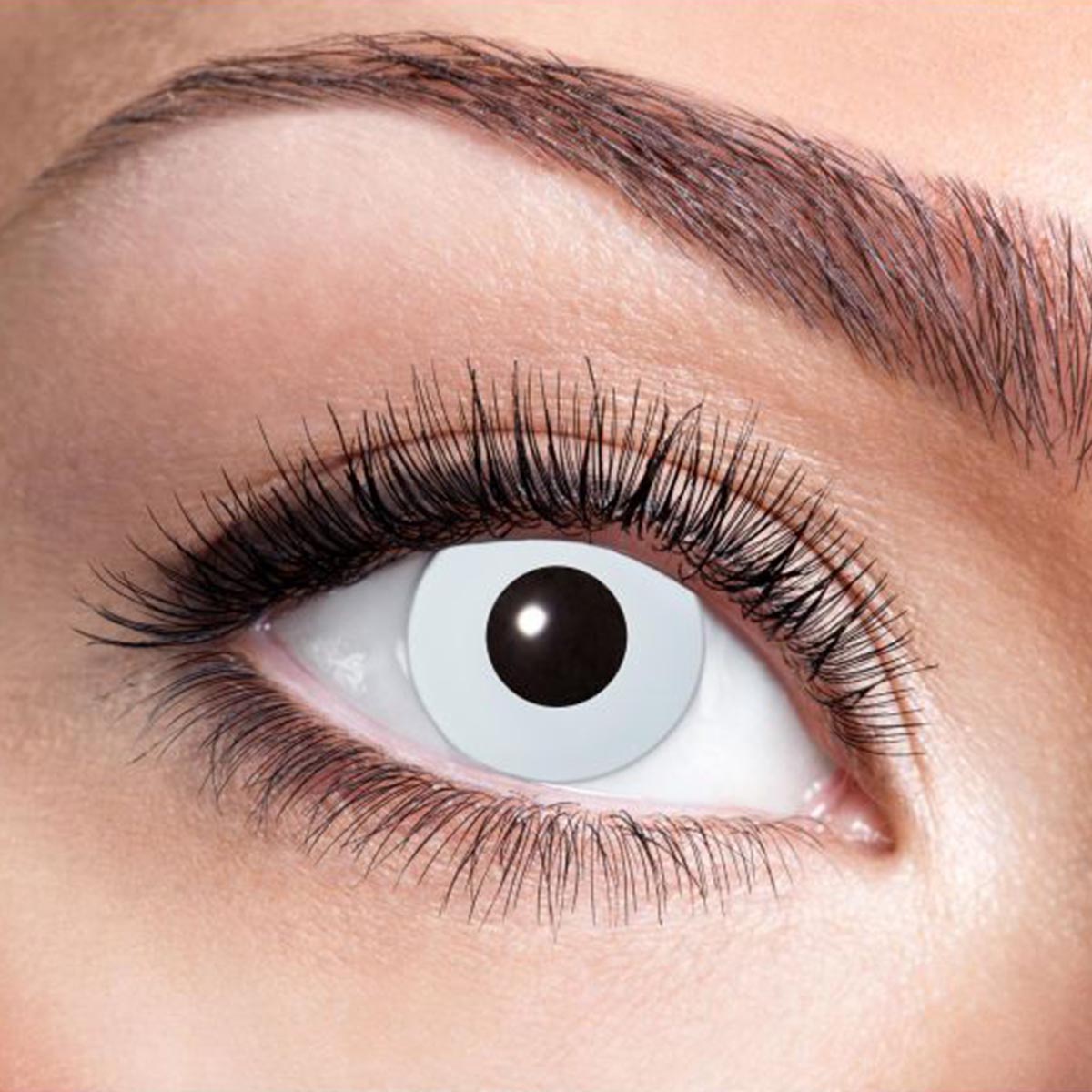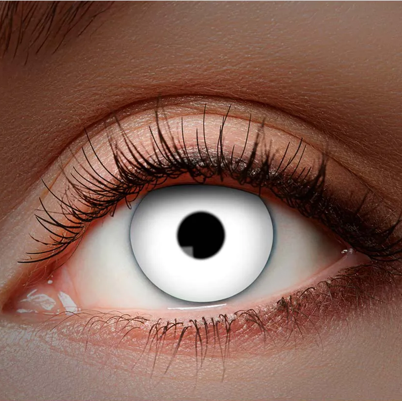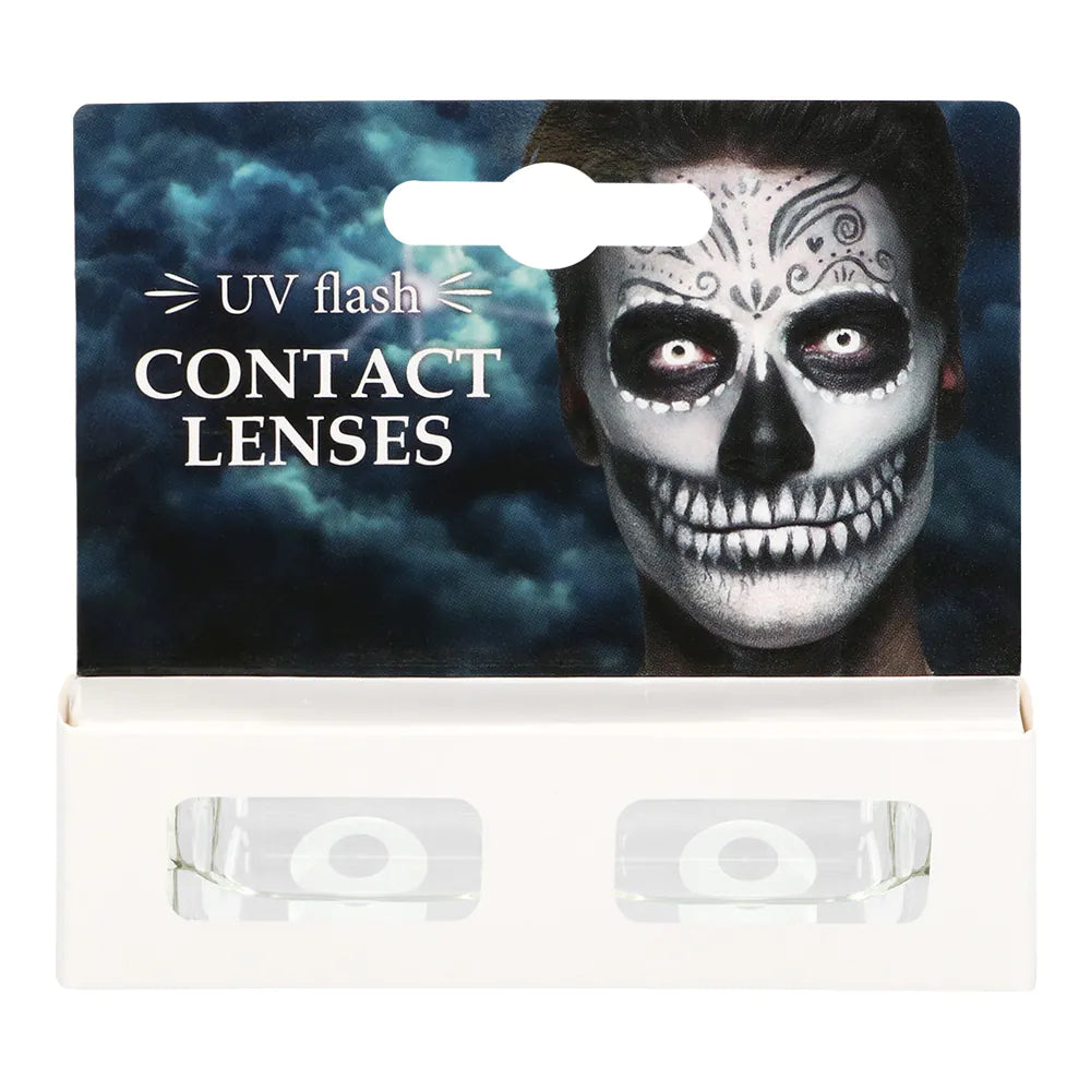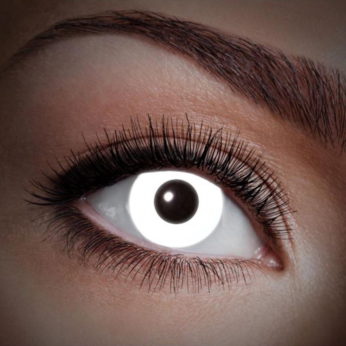 Heltäckande vita färglinser som tar över din ögonfärg och som även reagerar av uv-ljus och lyser starkt i blackligtljuset på festerna. En bra halloweenlins att bära för dig som vill skapa en extra effekt när du dyker upp på uv-festerna. Komplettera UV-linserna med en sminkning med uv-smink och du kan skapa olika motiv när du är i uv-ljuset och inte.
