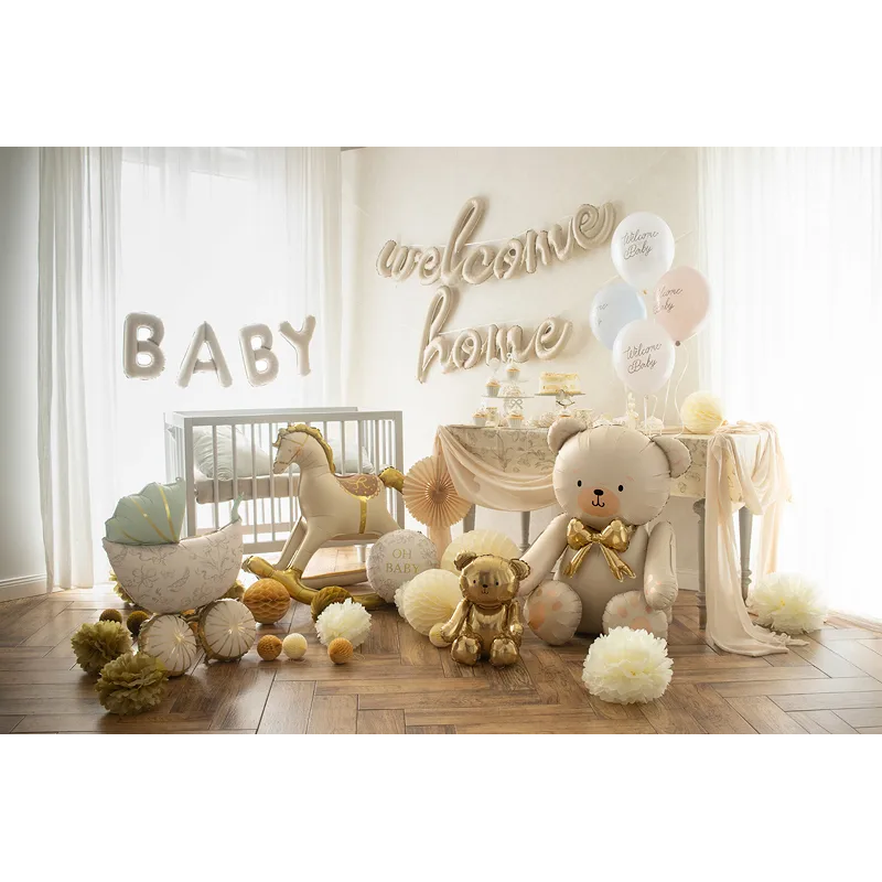 Gör firandet extra charmigt med denna söta folieballong formad som en nallebjörn. Ballongen har en mjuk beige ton, rosiga detaljer och en elegant guldfärgad rosett som ger den ett lyxigt uttryck. Perfekt som dekoration vid babyshower, dop, kalas eller som en fin överraskning till någon du tycker om. Kan fyllas med luft eller helium och blir ett härligt blickfång i rummet. En dekor som sprider värme och glädje oavsett tillfälle.