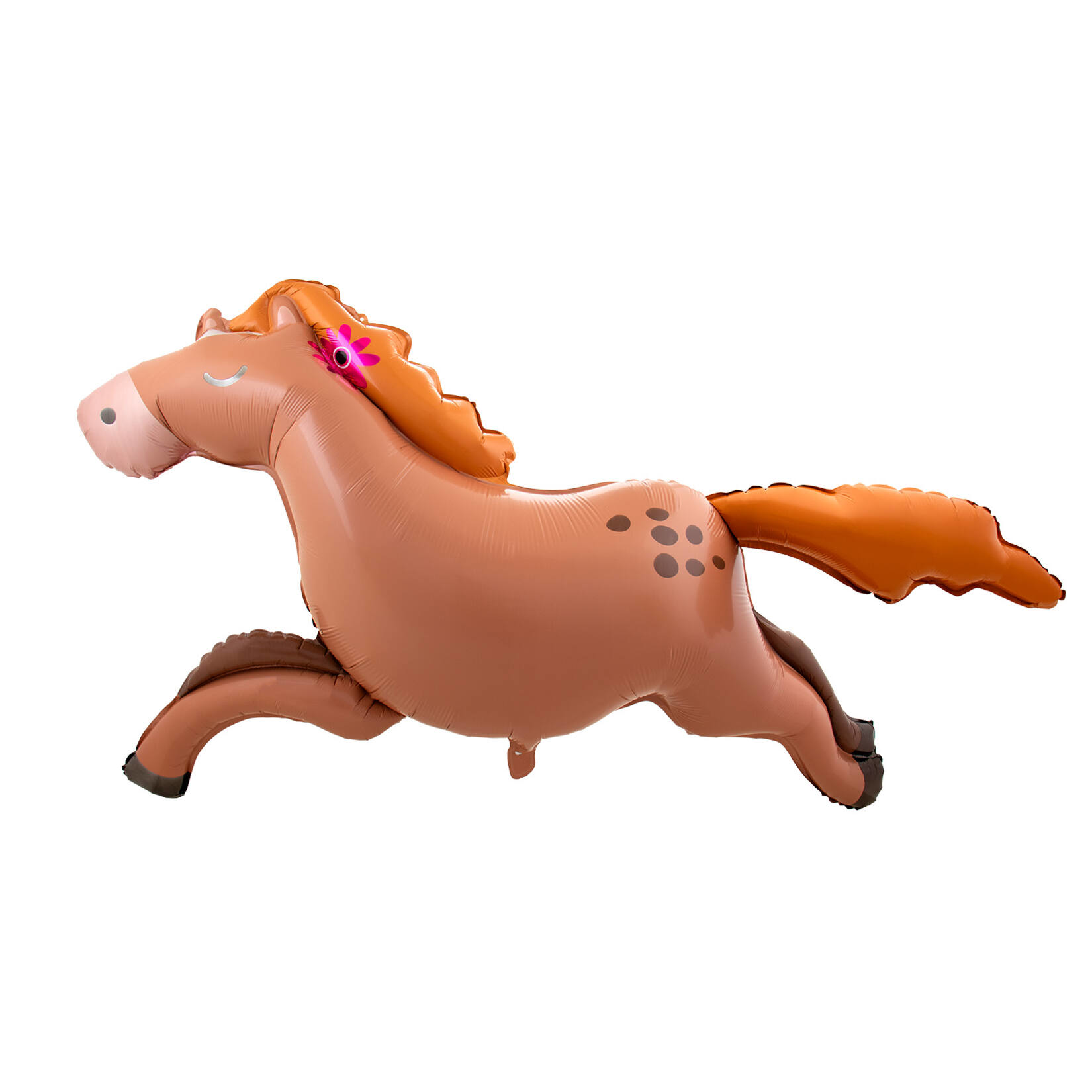 Skapa en lekfull och fantasifull stämning med denna fina folieballong formad som en springande häst. Med mjuka bruna toner, orange man och svans samt små dekorativa detaljer blir den en perfekt dekoration till barnkalas, hästtema eller djurfest.