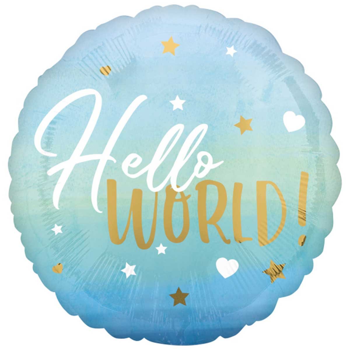 Den fina blå färgen är perfekt att dekorera in i en ballongbukett och hello world uttrycket är ett fint sätt att välkomma barnet hem första gången.