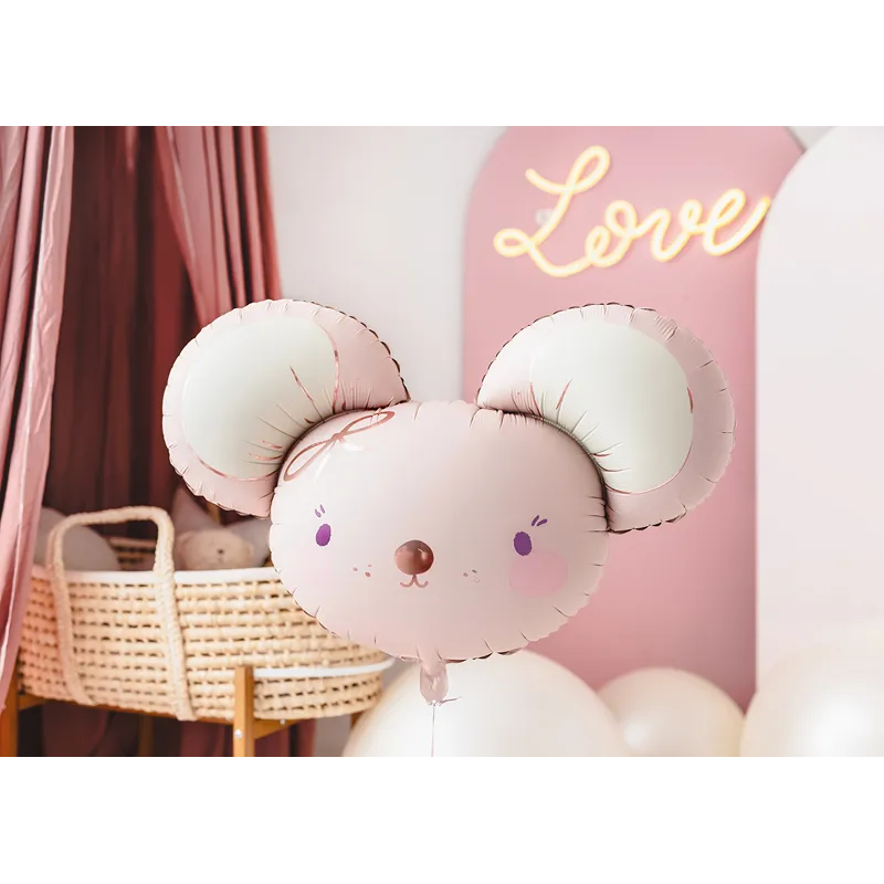 Denna söta folieballong formad som ett gulligt musansikte är perfekt för babyshower, dop, kalas eller barnrummet. Ballongen har en mjukt rosa ton med stora runda öron och charmiga detaljer i roséguld, som den lilla rosetten vid pannan och dekorativa accenter på öronen. Det söta ansiktet, med rosa kinder och små nosdetaljer, gör ballongen extra charmig och lekfull.