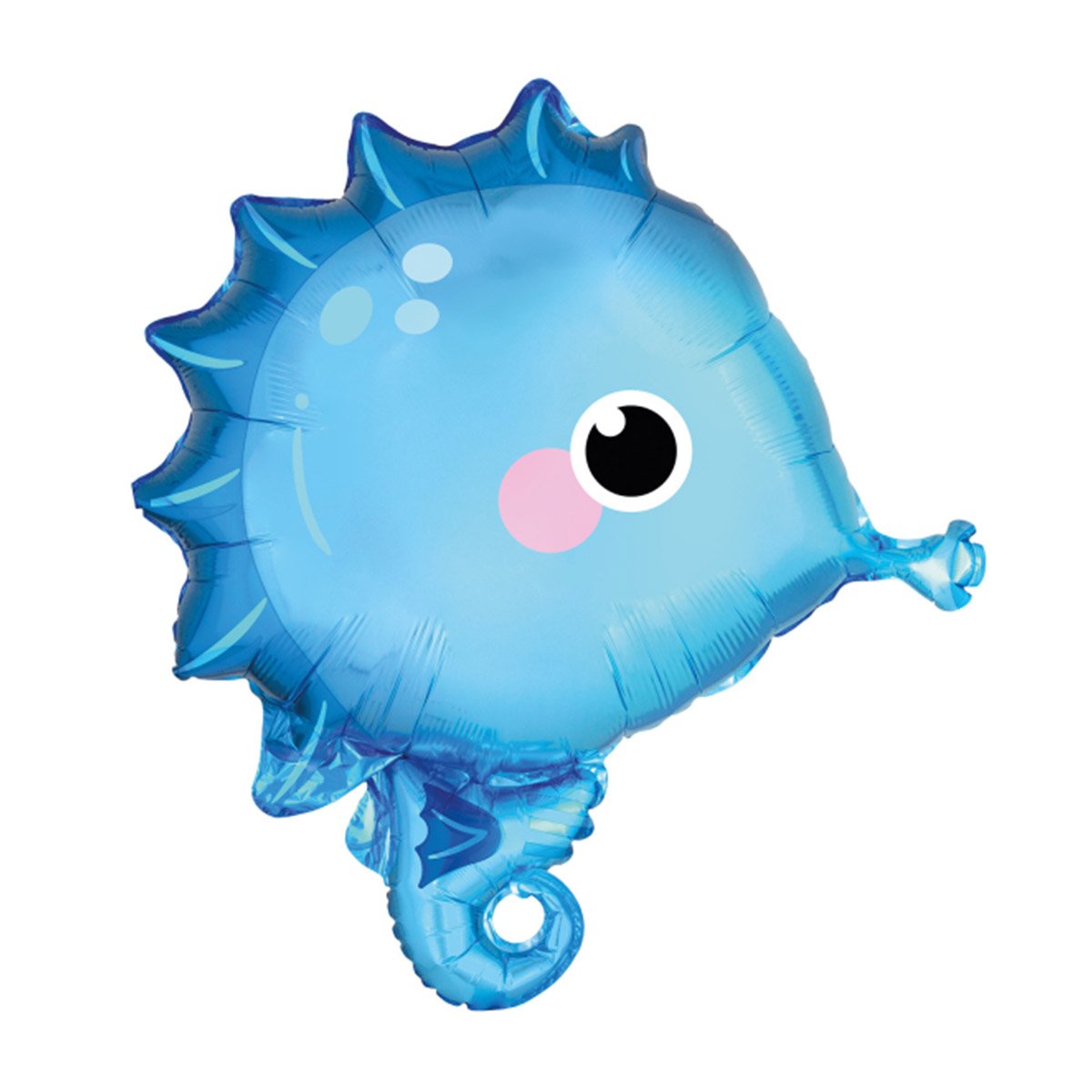 Låt festen dyka ner under ytan med den här underbart blå sjöhästen i folie – en perfekt ballong för barnkalas med havstema eller en färgstark babyshower! Formen är som en klassisk sjöhäst, komplett med en lockig svans, små fenor och ett stort öga som ger den massor av personlighet.