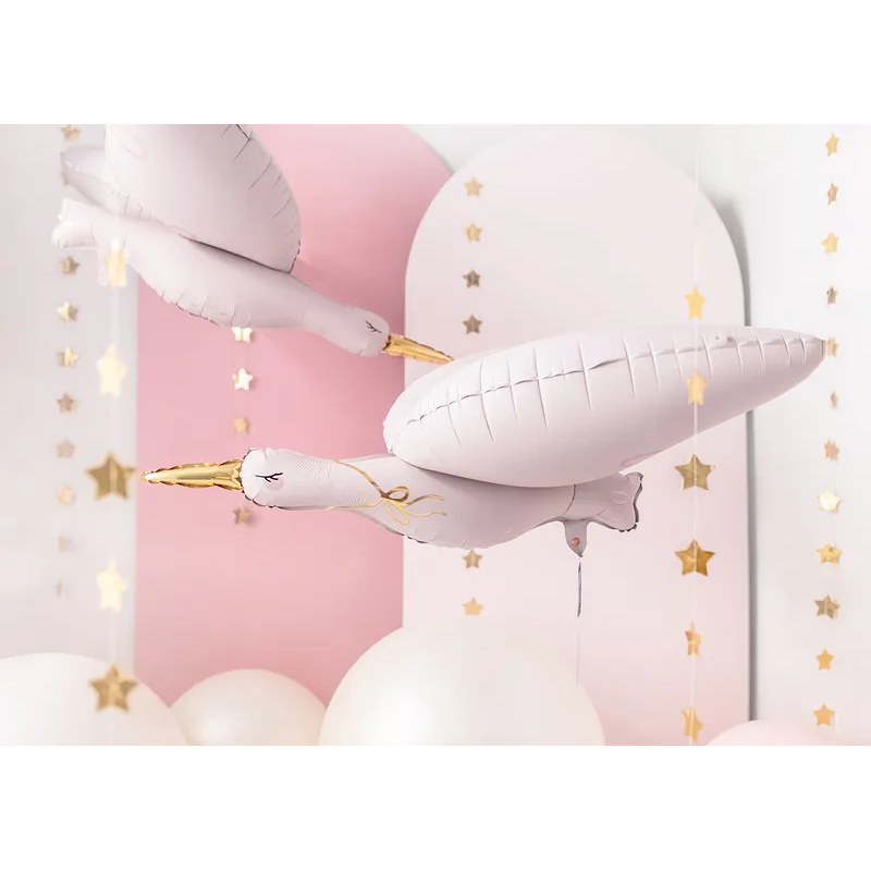 Denna charmiga folieballong formad som en elegant flygande stork är perfekt för babyshower, gender reveal eller för att fira en ny liten familjemedlem. Ballongen har en mjukt rosa ton med gyllene detaljer, inklusive en dekorativ guldnäbb och fina linjer längs kroppen som ger den ett exklusivt och lekfullt uttryck.
