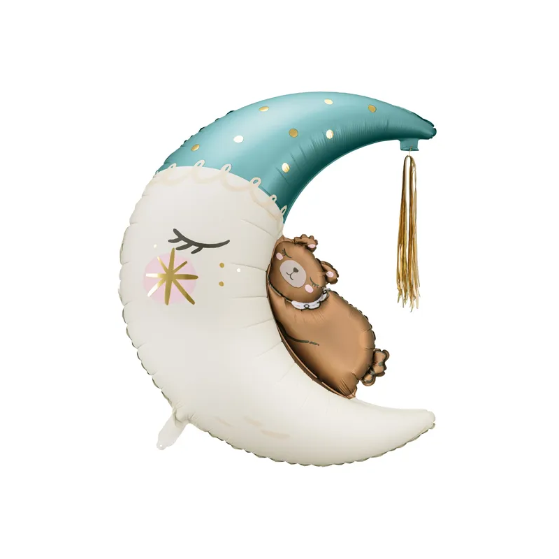 Skapa en drömlik och charmig stämning på babyshowern eller barnkalaset med denna sagolika folieballong formad som en måne som sover, med en liten björn som gosar tätt intill. Ballongen har mjuka pastellfärger, gyllene detaljer och en dekorativ tofs som hänger från månens spets, vilket ger ett extra magiskt uttryck. Perfekt som dekoration i ett tema med natthimmel, drömmar eller babyfest. Ballongen kan fyllas med både luft och helium och blir en underbar blickfångare oavsett hur den används.