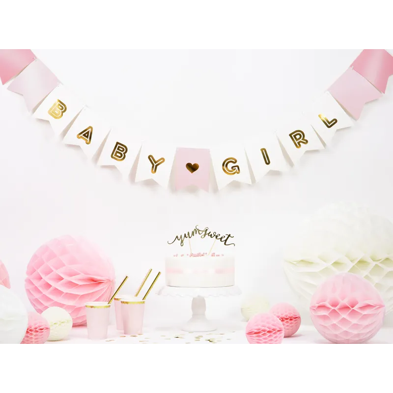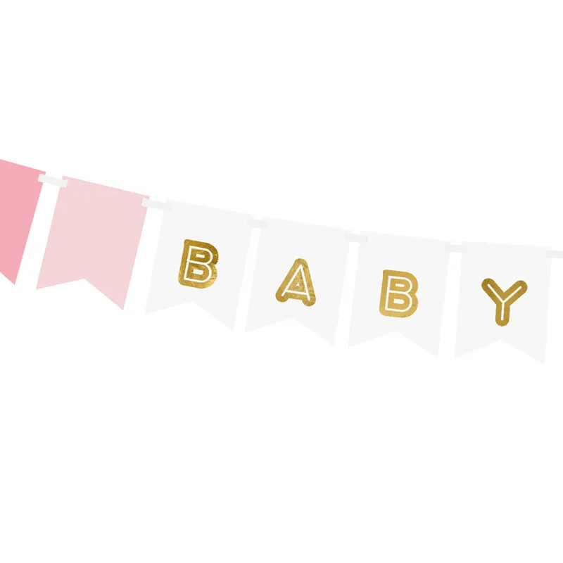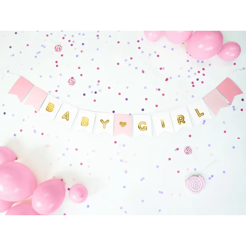 Skapa en söt och stämningsfull dekoration till babyshowern med denna charmiga Baby Girl-vimpel i mjuka rosa och vita toner. Vimplarna är prydda med eleganta gulddetaljer och ett litet hjärta som ger dekorationen en extra gullig touch. Den lätta girlangen är enkel att hänga upp på väggen, över bordet eller vid presenthörnan och passar perfekt för att rama in firandet av den lilla tjejen.
