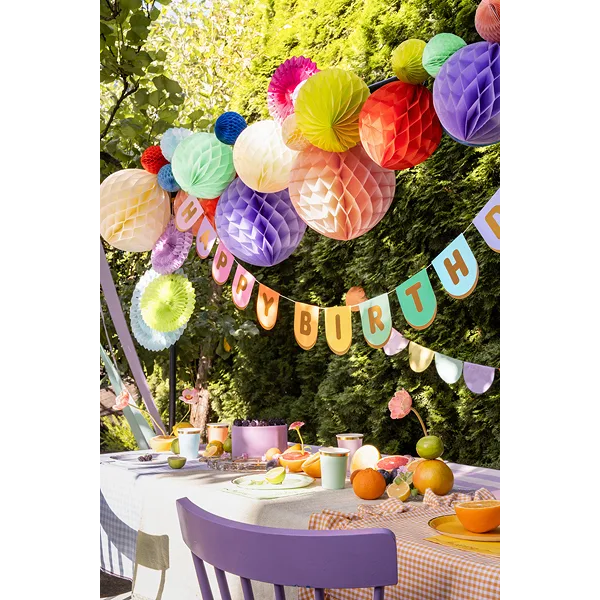 Dekorera kalaset med en färgglad girlang med texten “Happy Birthday”. De mjuka pastellfärgerna tillsammans med guldfärgade bokstäver skapar en festlig och elegant stämning som passar perfekt för födelsedagsfiranden.